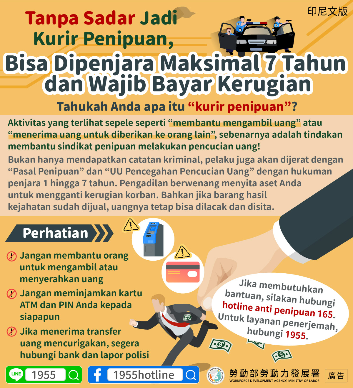 Jika membutuhkan bantuan, silakan hubungi hotline anti penipuan 165. Untuk layanan penerjemah, hubungi 1955.