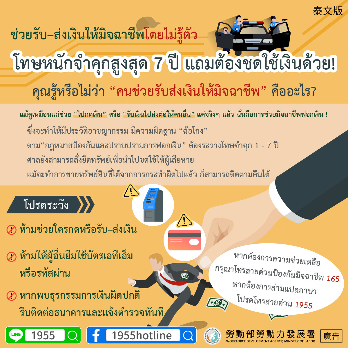 หากต้องการความช่วยเหลือ กรุณาโทรสายด่วนป้องกันมิจฉาชีพ 165หากต้องการล่ามแปลภาษา โปรดโทรสายด่วน 1955