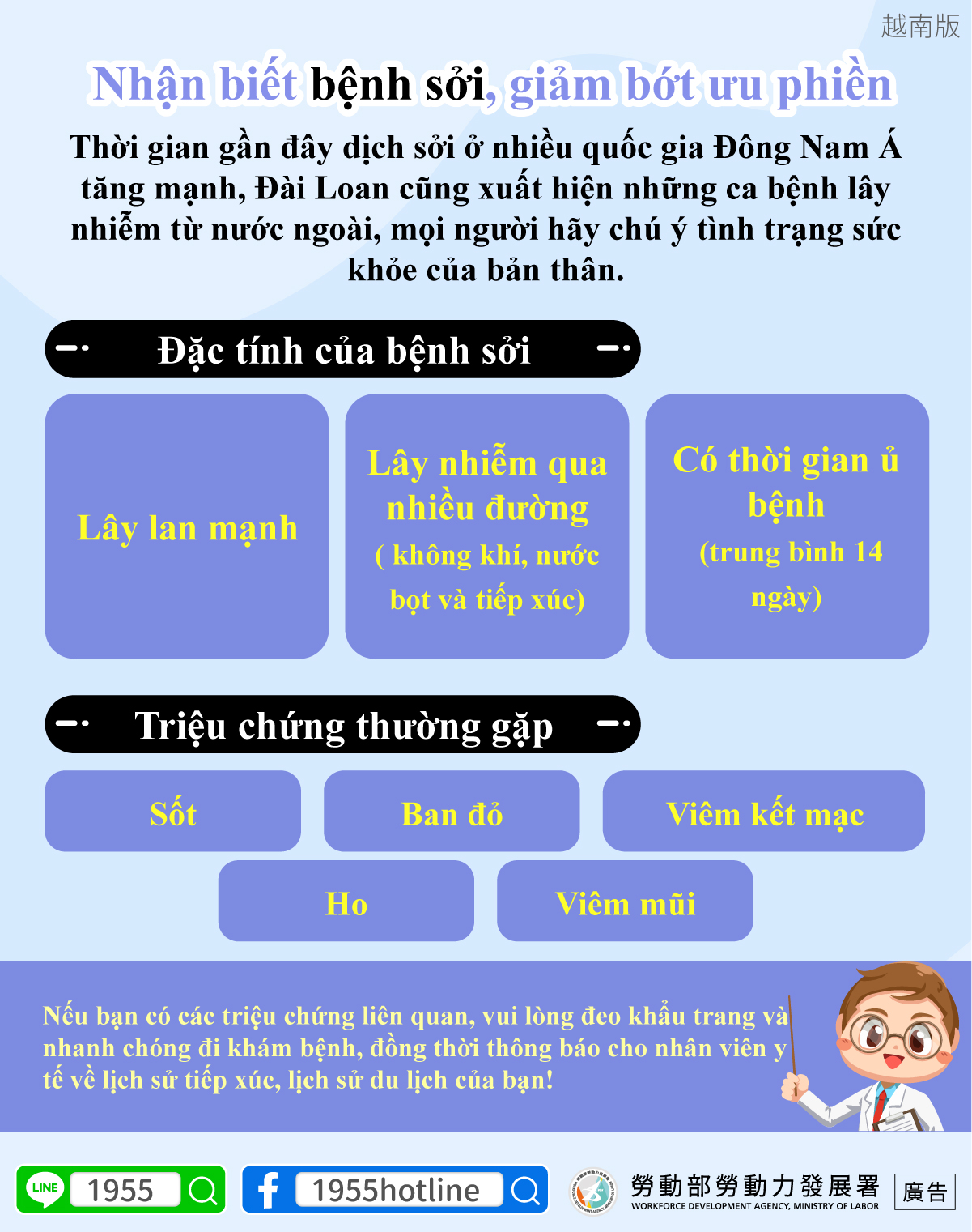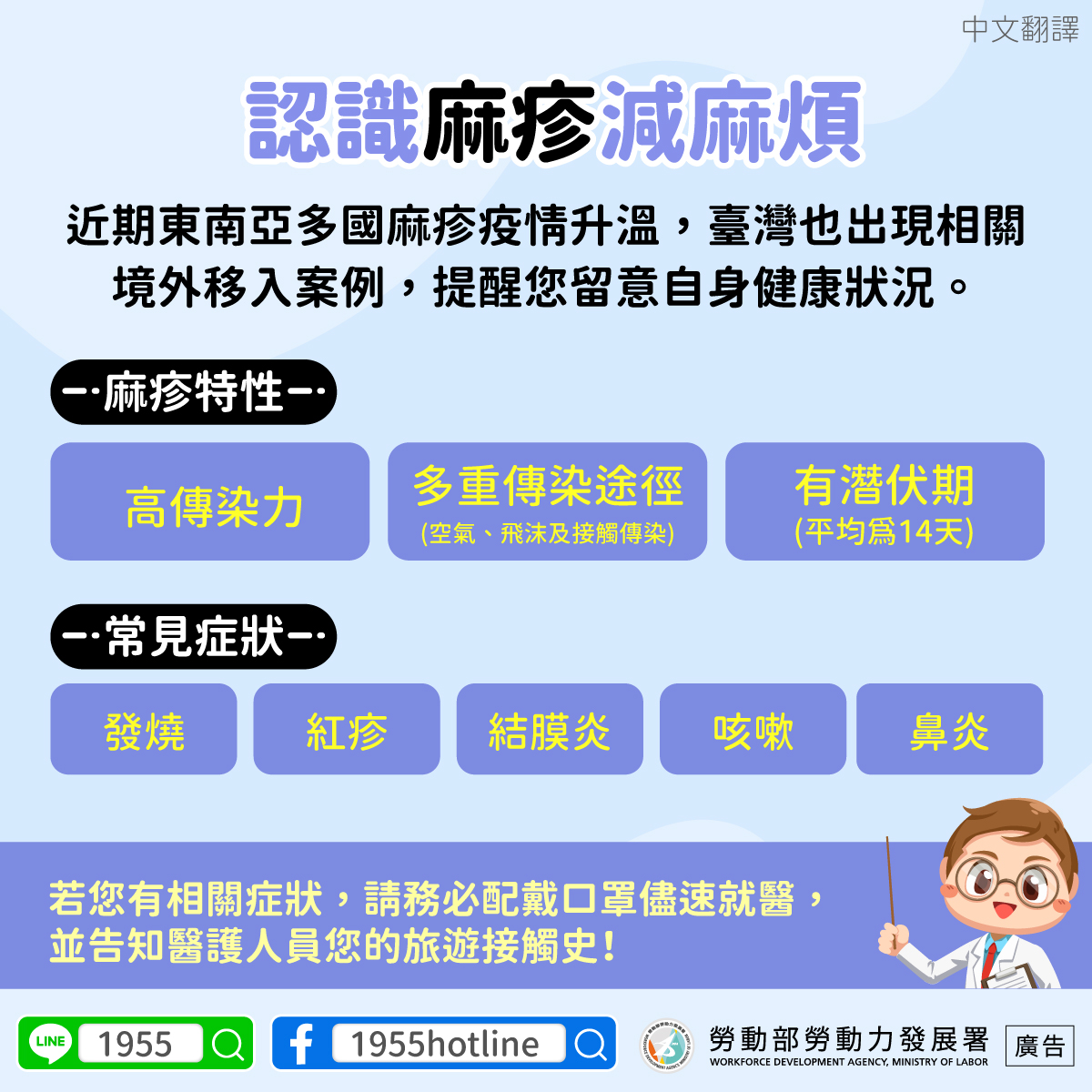 Recently, there has been an increase in cases of measles in countries across Southeast Asia and imported cases in Taiwan. The Ministry of Labor urges foreign workers to pay attention to their health.