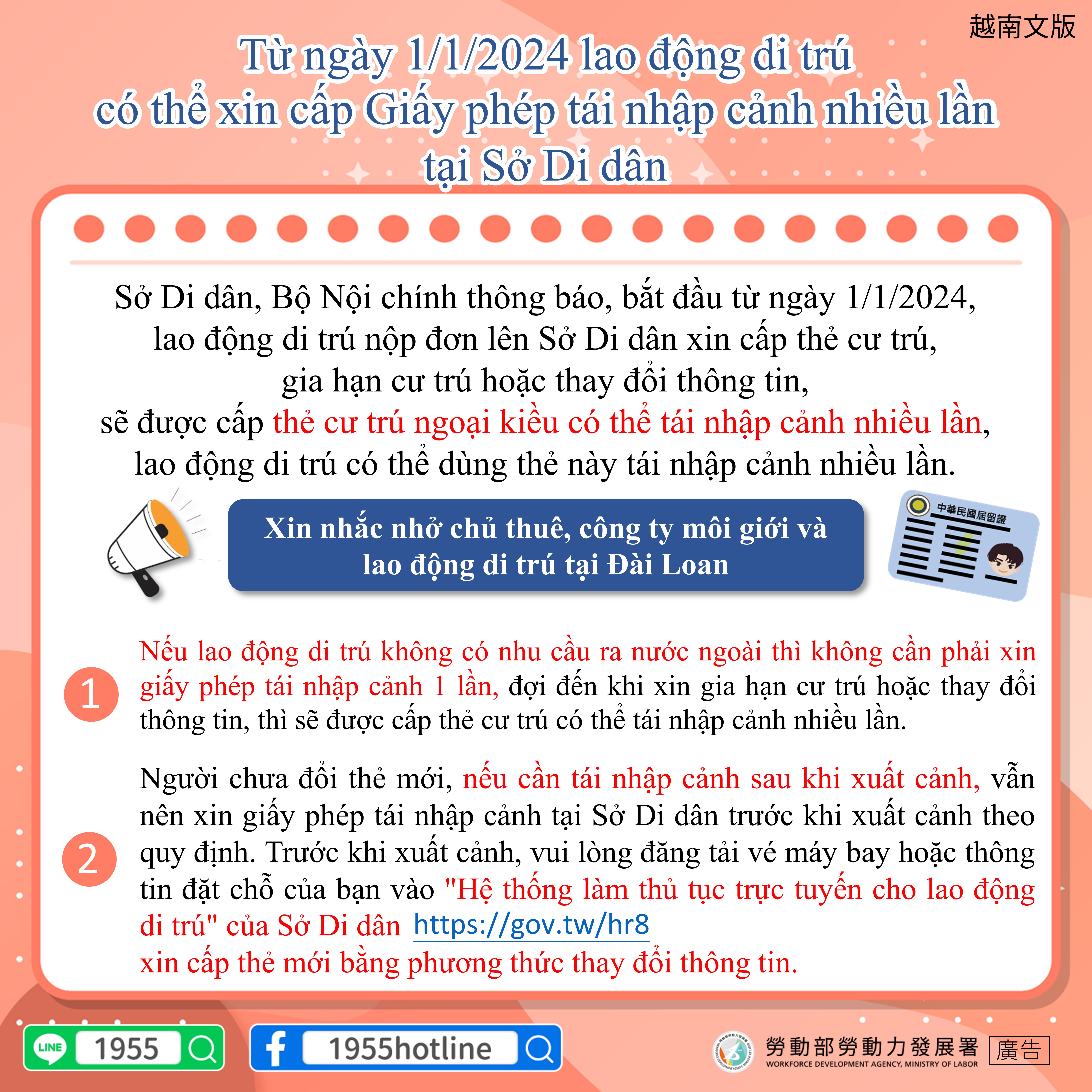 •Người chưa đổi thẻ mới, nếu cần tái nhập cảnh sau khi xuất cảnh, vẫn nên xin giấy phép tái nhập cảnh tại Sở Di dân trước khi xuất cảnh theo quy định. Trước khi xuất cảnh, vui lòng đăng tải vé máy bay hoặc thông tin đặt chỗ của bạn vào "Hệ thống làm thủ tục trực tuyến cho lao động di trú" của Sở Di dân https://gov.tw/hr8 xin cấp thẻ mới bằng phương thức thay đổi thông tin.