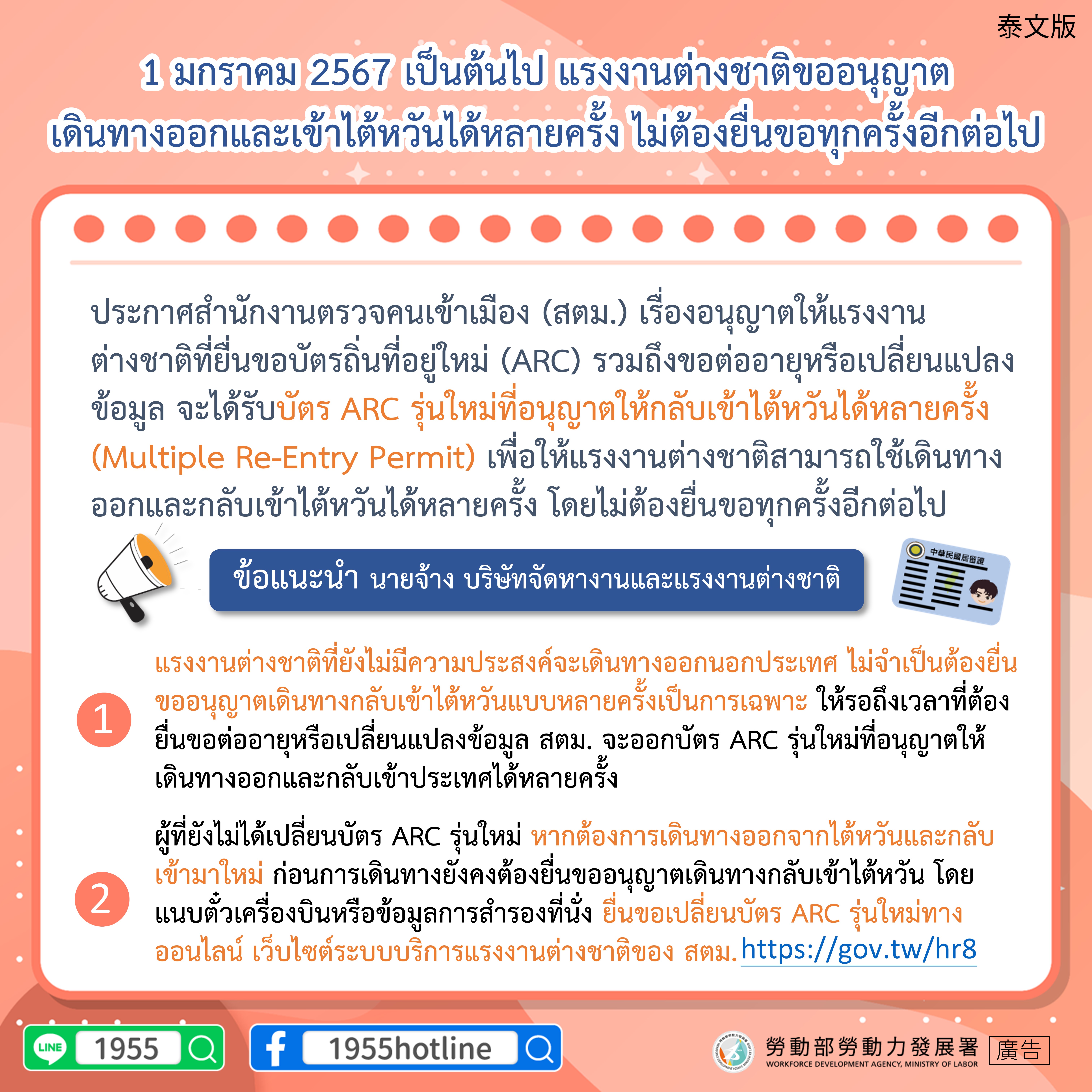 ประกาศสำนักงานตรวจคนเข้าเมือง (สตม.) เรื่องอนุญาตให้แรงงานต่างชาติที่ยื่นขอบัตรถิ่นที่อยู่ใหม่ (ARC) รวมถึงขอต่ออายุหรือเปลี่ยนแปลงข้อมูล จะได้รับบัตร ARC รุ่นใหม่ที่อนุญาตให้กลับเข้าไต้หวันได้หลายครั้ง (Multiple Re-Entry Permit) เพื่อให้แรงงานต่างชาติสามารถใช้เดินทางออกและกลับเข้าไต้หวันได้หลายครั้ง โดยไม่ต้องยื่นขอทุกครั้งอีกต่อไป