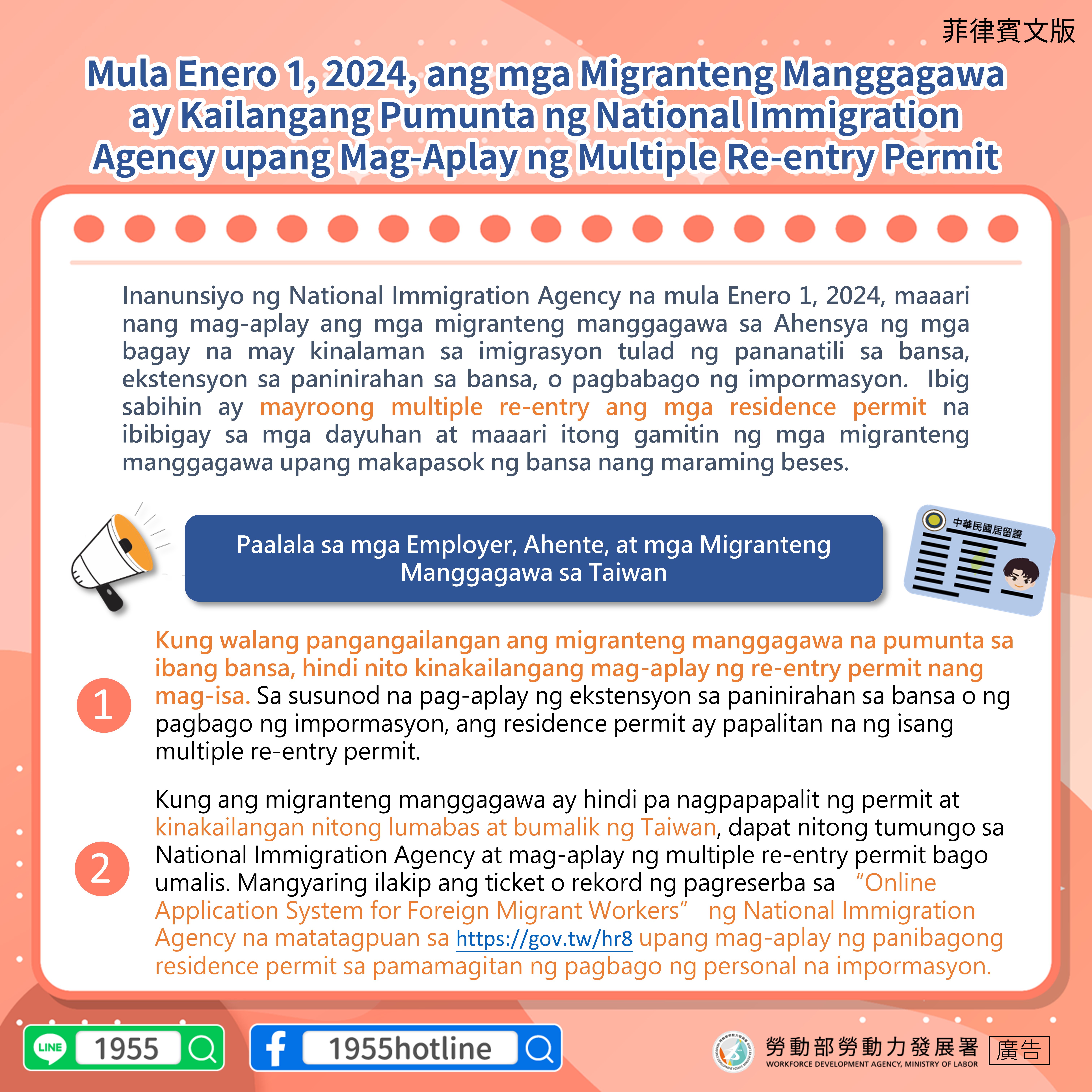 •Kung ang migranteng manggagawa ay hindi pa nagpapapalit ng permit at kinakailangan nitong lumabas at bumalik ng Taiwan, dapat nitong tumungo sa National Immigration Agency at mag-aplay ng multiple re-entry permit bago umalis. Mangyaring ilakip ang ticket o rekord ng pagreserba sa “Online Application System for Foreign Migrant Workers” ng National Immigration Agency na matatagpuan sa https://gov.tw/hr8 upang mag-aplay ng panibagong residence permit sa pamamagitan ng pagbago ng personal na impormasyon.a