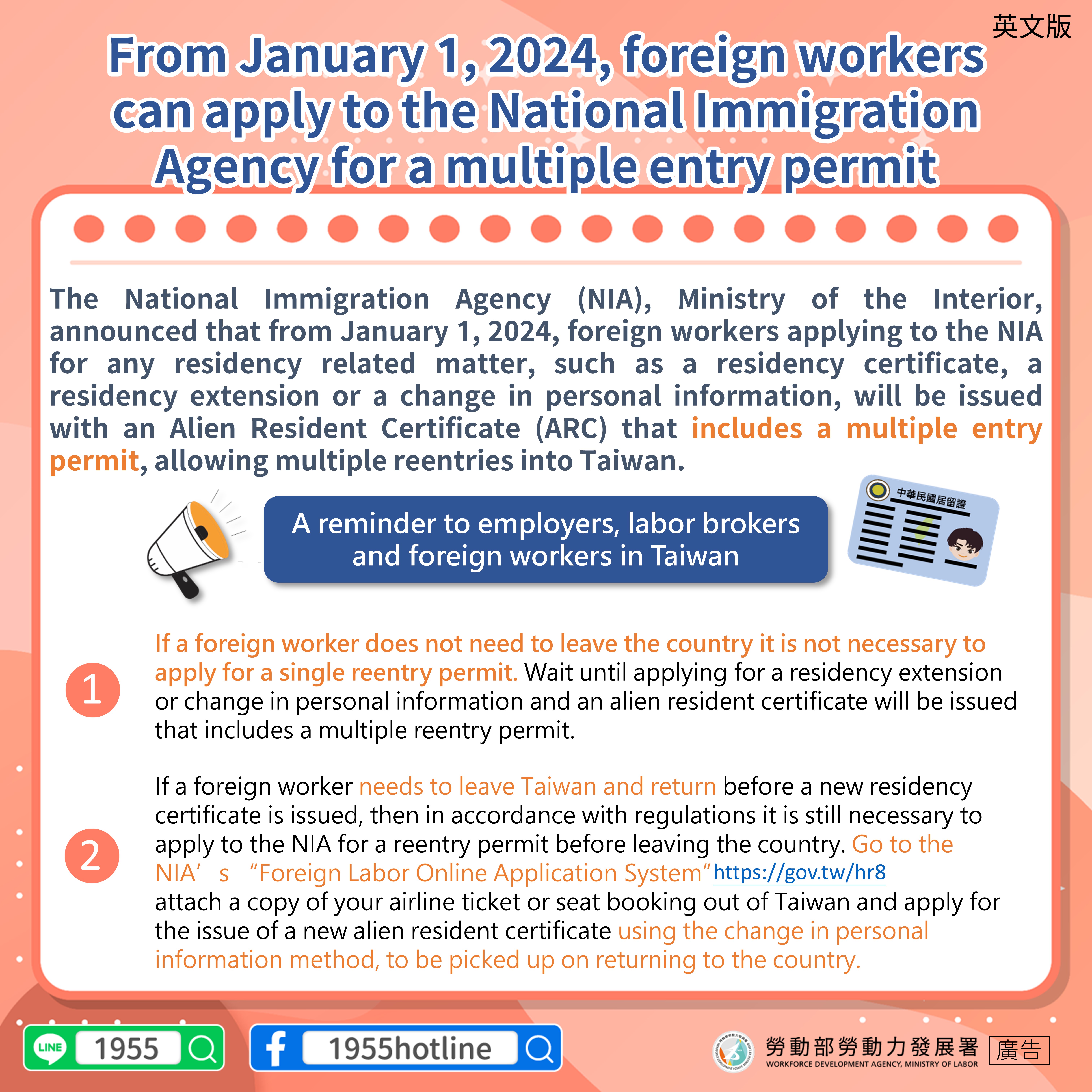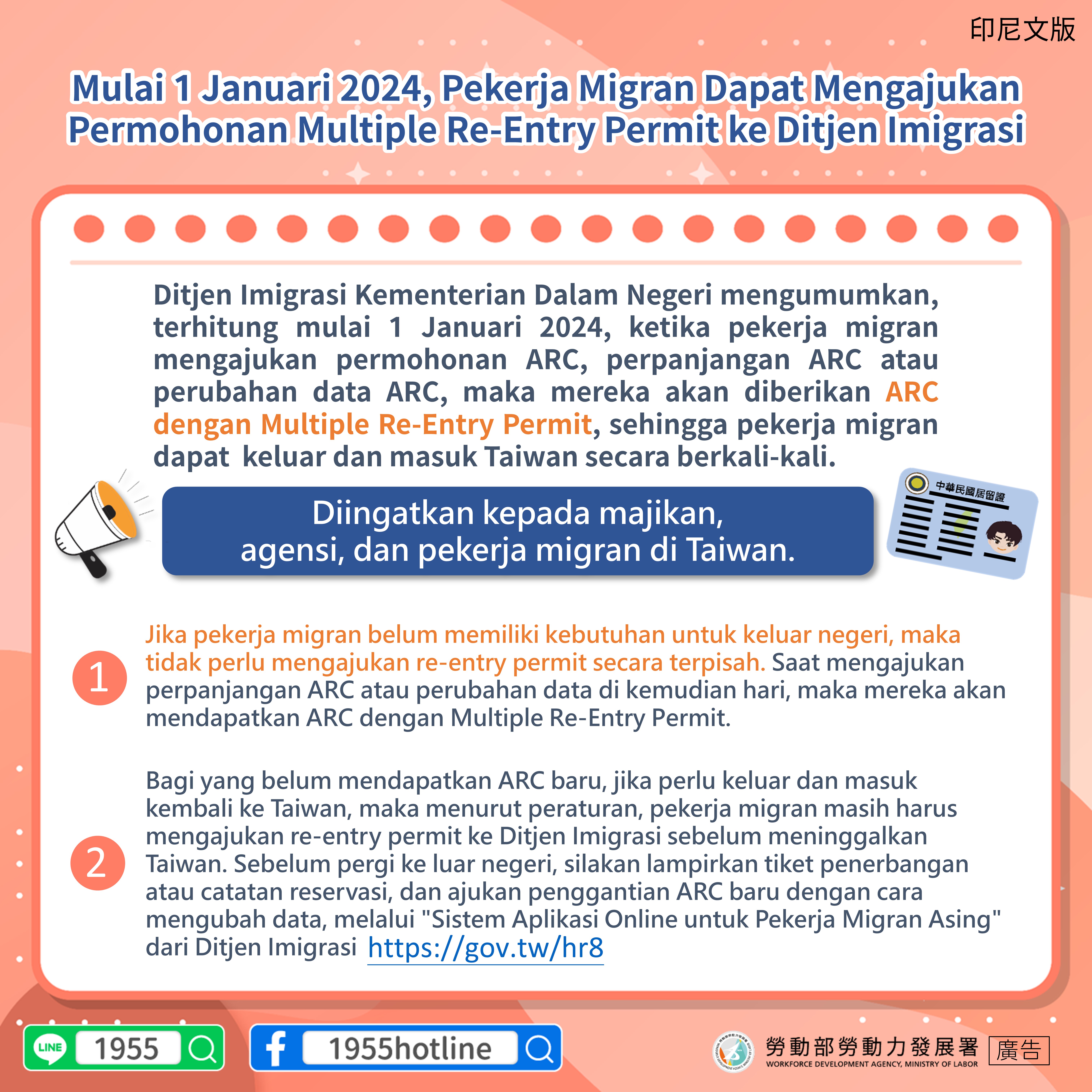 Ditjen Imigrasi Kementerian Dalam Negeri mengumumkan, terhitung mulai 1 Januari 2024, ketika pekerja migran mengajukan permohonan ARC, perpanjangan ARC atau perubahan data ARC, maka mereka akan diberikan ARC dengan Multiple Re-Entry Permit, sehingga pekerja migran dapat keluar dan masuk Taiwan secara berkali-kali.