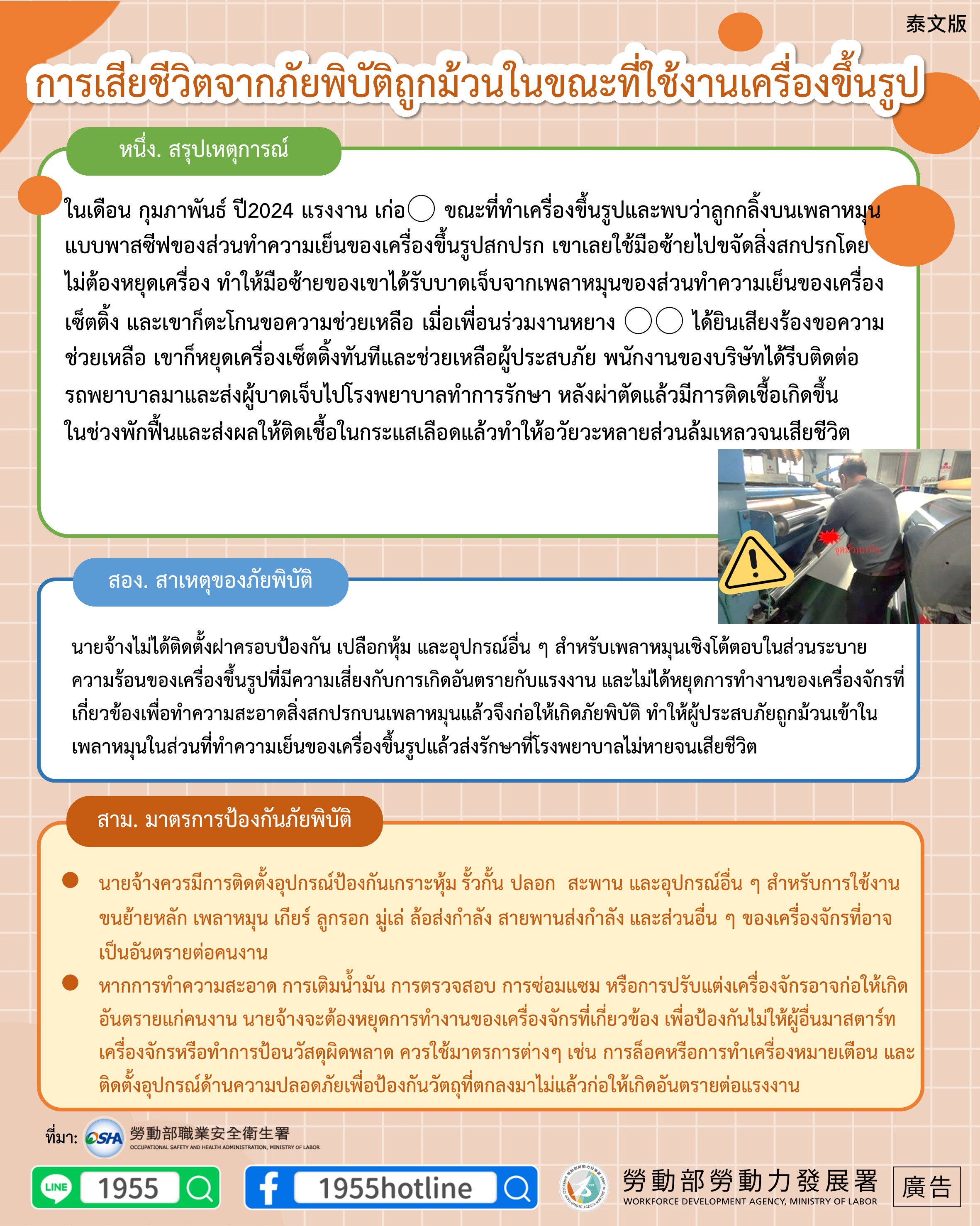 ในเดือน กุมภาพันธ์ ปี2024 แรงงาน เก่อ○ ขณะที่ทำเครื่องขึ้นรูปและพบว่าลูกกลิ้งบนเพลาหมุนแบบพาสซีฟของส่วนทำความเย็นของเครื่องขึ้นรูปสกปรก เขาเลยใช้มือซ้ายไปขจัดสิ่งสกปรกโดยไม่ต้องหยุดเครื่อง ทำให้มือซ้ายของเขาได้รับบาดเจ็บจากเพลาหมุนของส่วนทำความเย็นของเครื่องเซ็ตติ้ง และเขาก็ตะโกนขอความช่วยเหลือ เมื่อเพื่อนร่วมงานหยาง ○○ ได้ยินเสียงร้องขอความช่วยเหลือ เขาก็หยุดเครื่องเซ็ตติ้งทันทีและช่วยเหลือผู้ประสบภัย พนักงานของบริษัทได้รีบติดต่อรถพยาบาลมาและส่งผู้บาดเจ็บไปโรงพยาบาลทำการรักษา หลังผ่าตัดแล้วมีการติดเชื้อเกิดขึ้นในช่วงพักฟื้นและส่งผลให้ติดเชื้อในกระแสเลือดแล้วทำให้อวัยวะหลายส่วนล้มเหลวจนเสียชีวิต