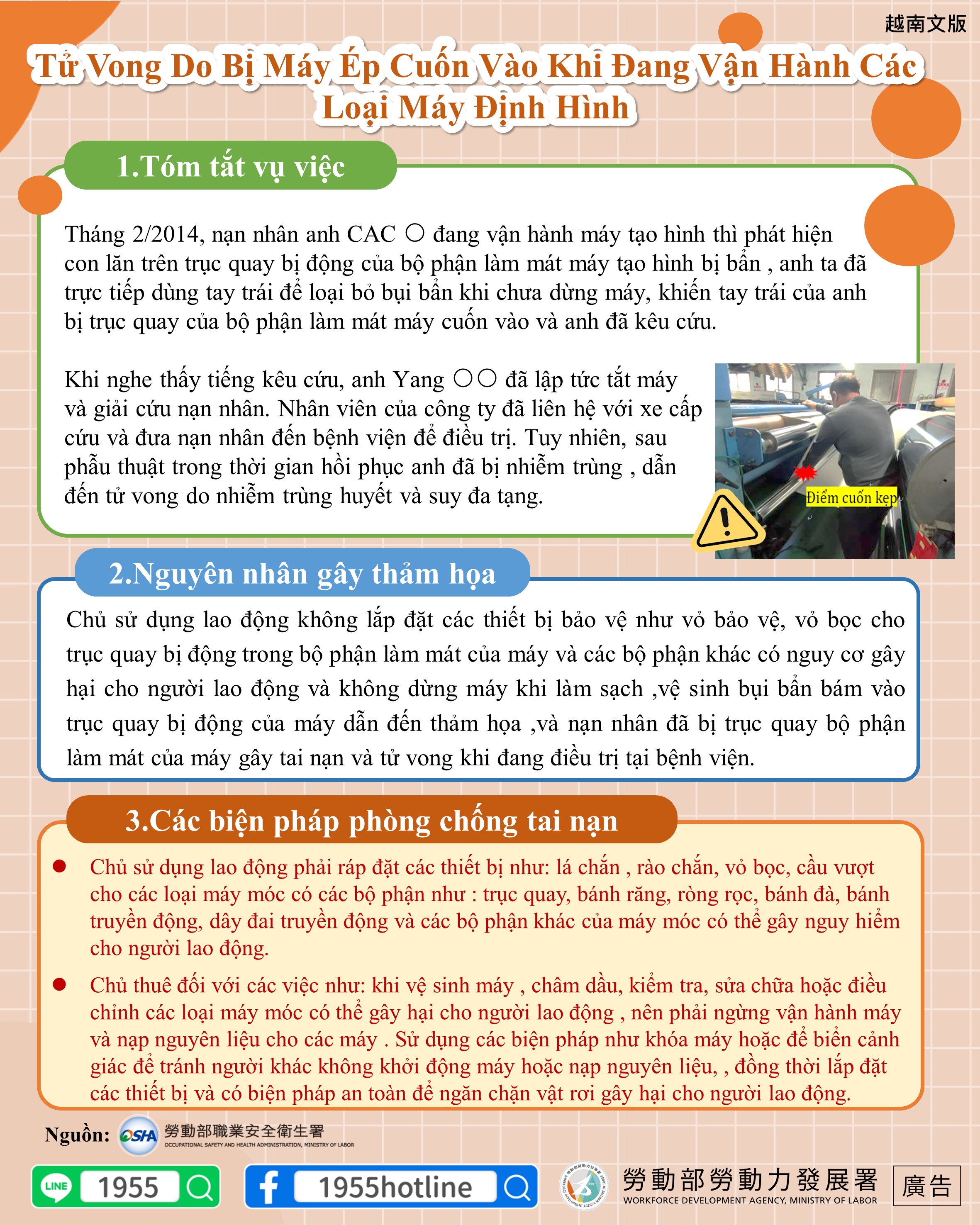 Tháng 2/2014, nạn nhân anh CAC ○ đang vận hành máy tạo hình thì phát hiện con lăn trên trục quay bị động của bộ phận làm mát máy tạo hình bị bẩn , anh ta đã trực tiếp dùng tay trái để loại bỏ bụi bẩn khi chưa dừng máy, khiến tay trái của anh bị trục quay của bộ phận làm mát máy cuốn vào và anh đã kêu cứu. Khi nghe thấy tiếng kêu cứu, anh Yang ○○ đã lập tức tắt máy và giải cứu nạn nhân. Nhân viên của công ty đã liên hệ với xe cấp cứu và đưa nạn nhân đến bệnh viện để điều trị. Tuy nhiên, sau phẫu thuật trong thời gian hồi phục anh đã bị nhiễm trùng , dẫn đến tử vong do nhiễm trùng huyết và suy đa tạng.