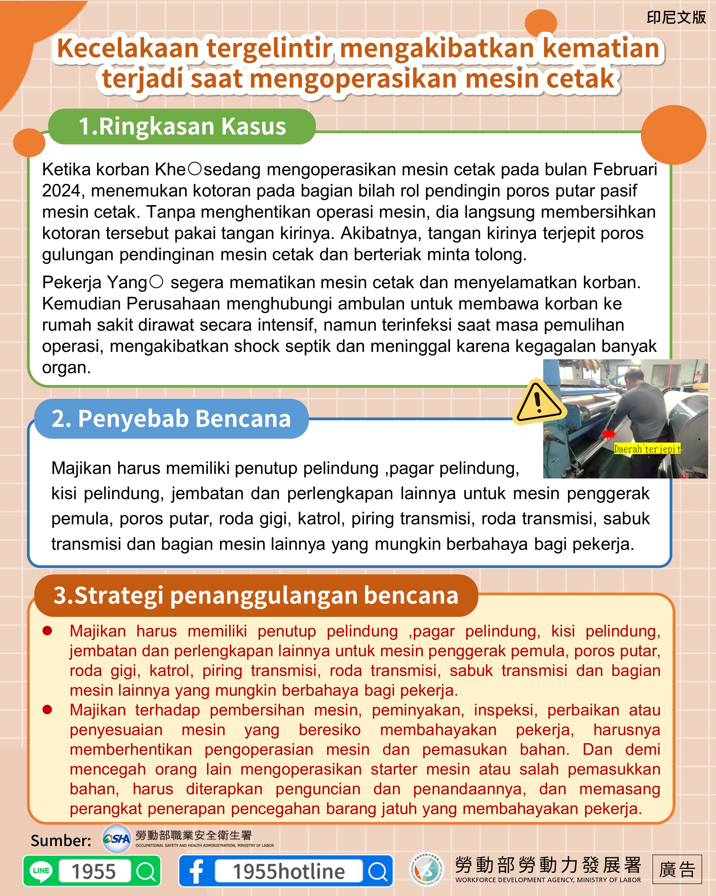 Ketika korban Khe○sedang mengoperasikan mesin cetak pada bulan Februari 2024, menemukan kotoran pada bagian bilah rol pendingin poros putar pasif mesin cetak. Tanpa menghentikan operasi mesin, dia langsung membersihkan kotoran tersebut pakai tangan kirinya. Akibatnya, tangan kirinya terjepit poros gulungan pendinginan mesin cetak dan berteriak minta tolong. Pekerja Yang○ segera mematikan mesin cetak dan menyelamatkan korban. Kemudian Perusahaan menghubungi ambulan untuk membawa korban ke rumah sakit dirawat secara intensif, namun terinfeksi saat masa pemulihan operasi, mengakibatkan shock septik dan meninggal karena kegagalan banyak organ.