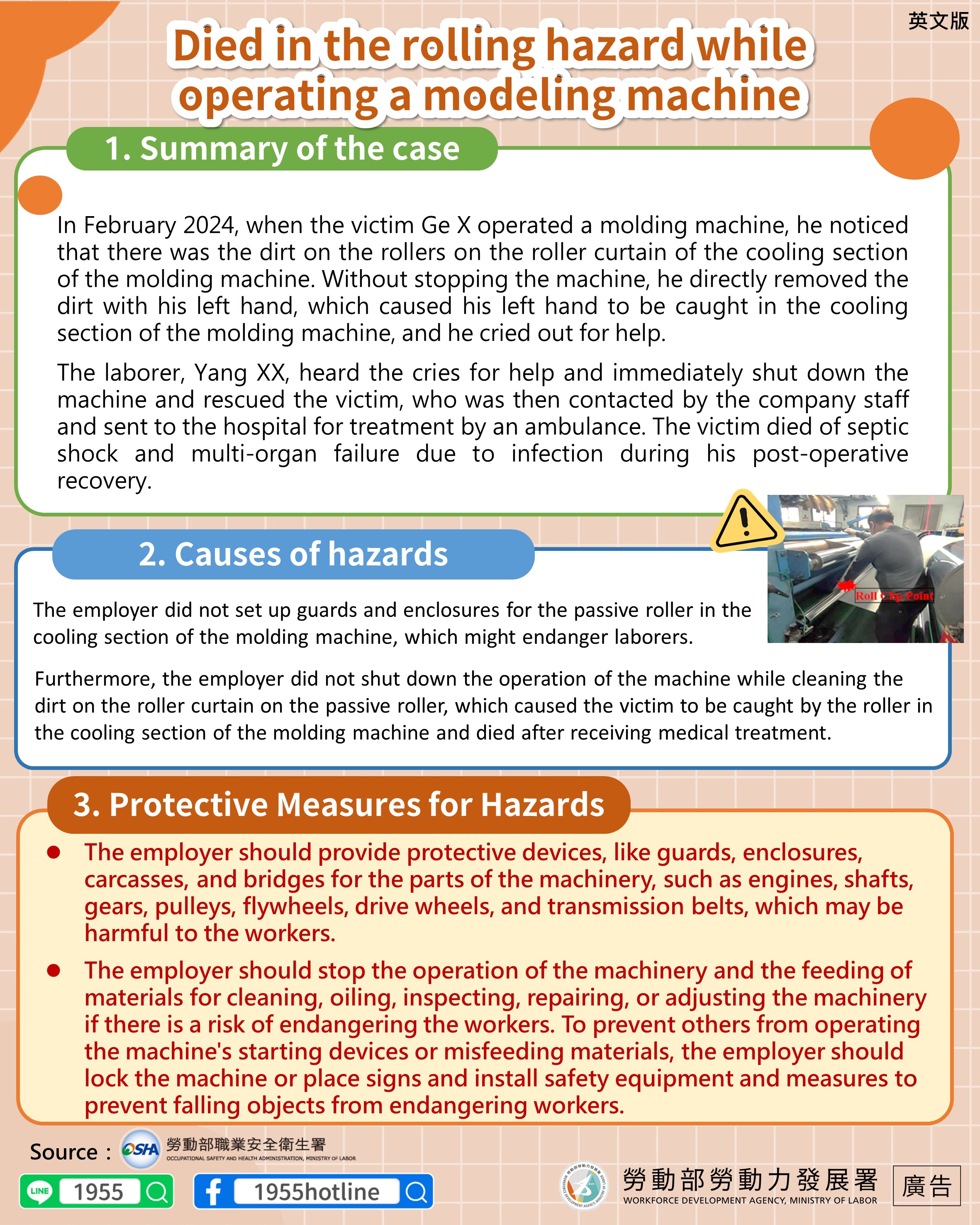 The employer did not set up guards and enclosures for the passive roller in the cooling section of the molding machine, which might endanger laborers. Furthermore, the employer did not shut down the operation of the machine while cleaning the dirt on the roller curtain on the passive roller, which caused the victim to be caught by the roller in the cooling section of the molding machine and died after receiving medical treatment.