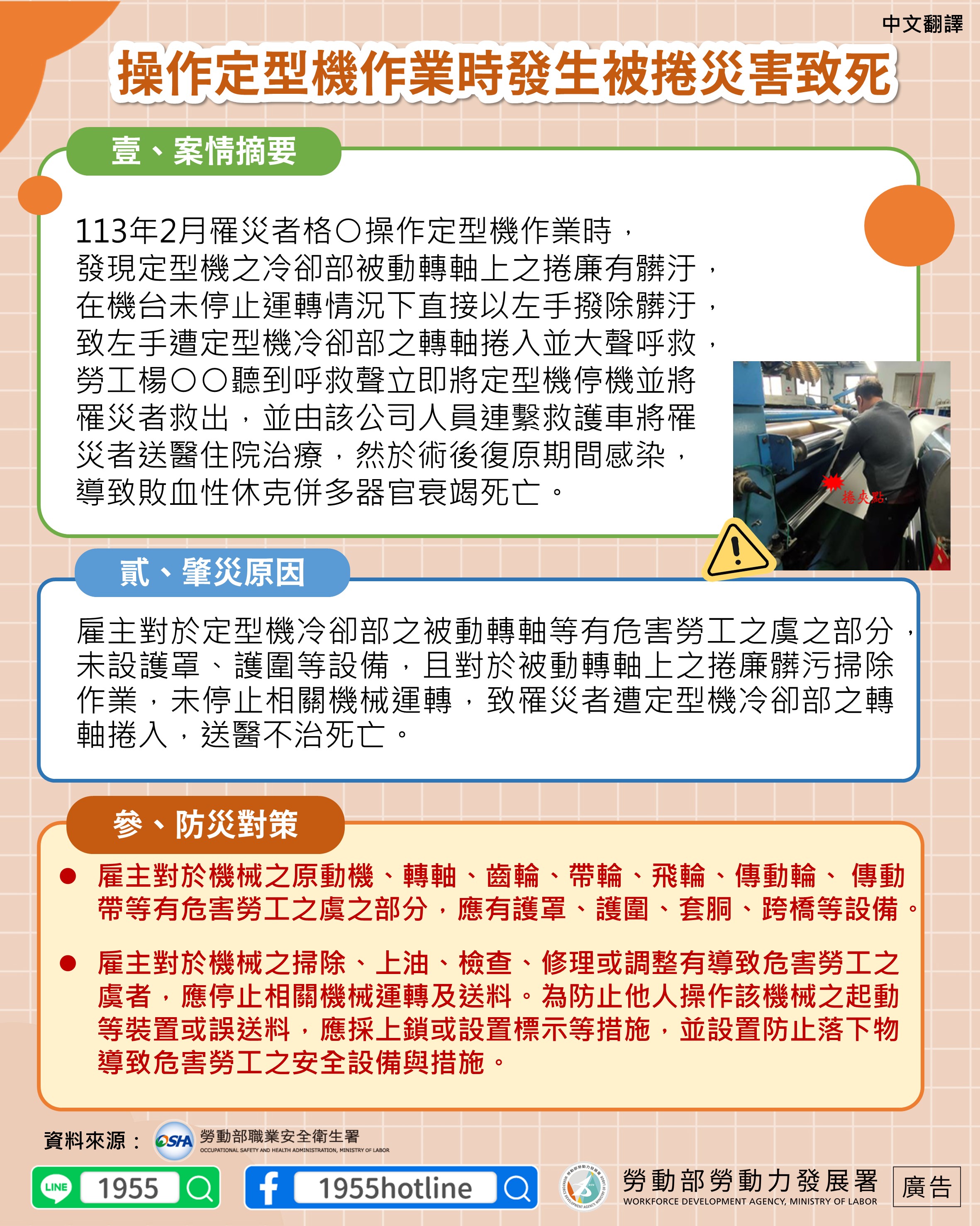 113年2月罹災者格○操作定型機作業時,發現定型機之冷卻部被動轉軸上之捲廉有髒汙,在機台未停止運轉情況下直接以左手撥除髒汙,致左手遭定型機冷卻部之轉軸捲入並大聲呼救,勞工楊○○聽到呼救聲立即將定型機停機並將罹災者救出,並由該公司人員連繫救護車將罹災者送醫住院治療,然於術後復原期間感染,導致敗血性休克併多器官衰竭死亡。