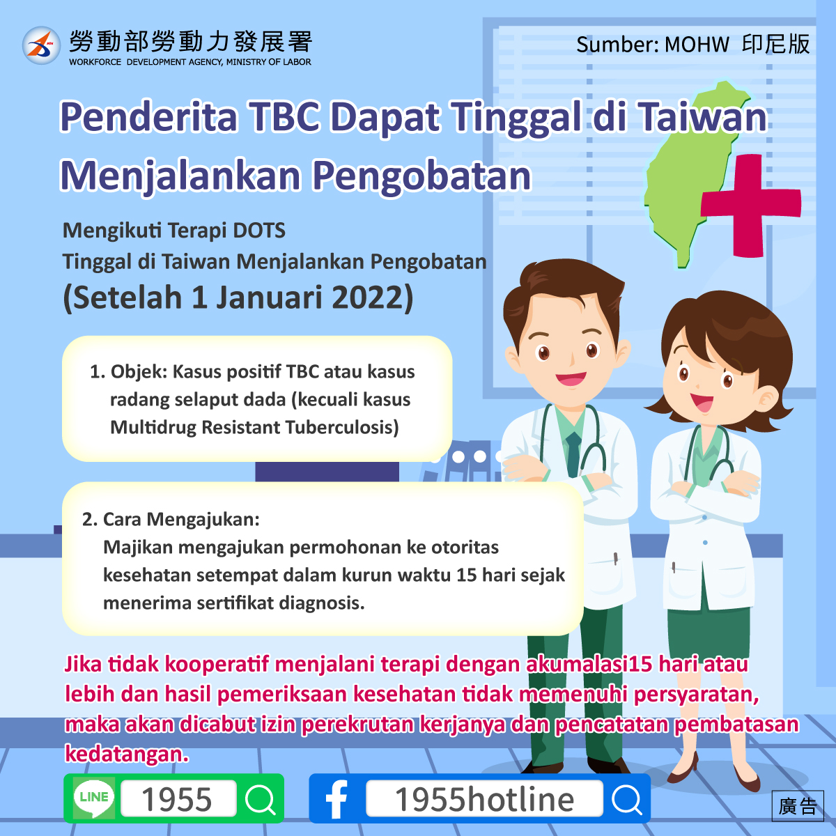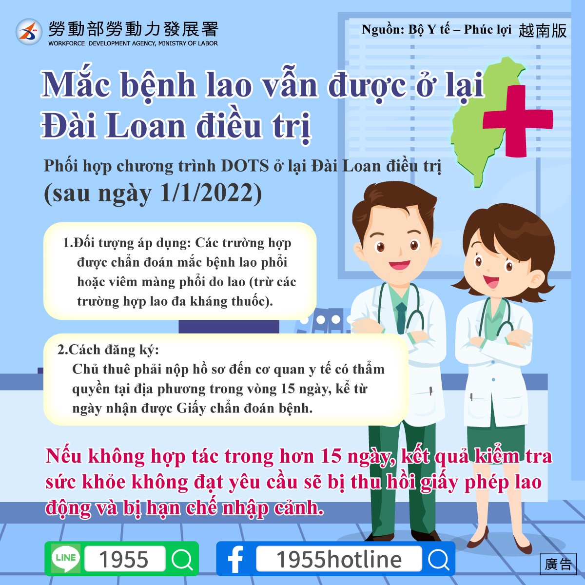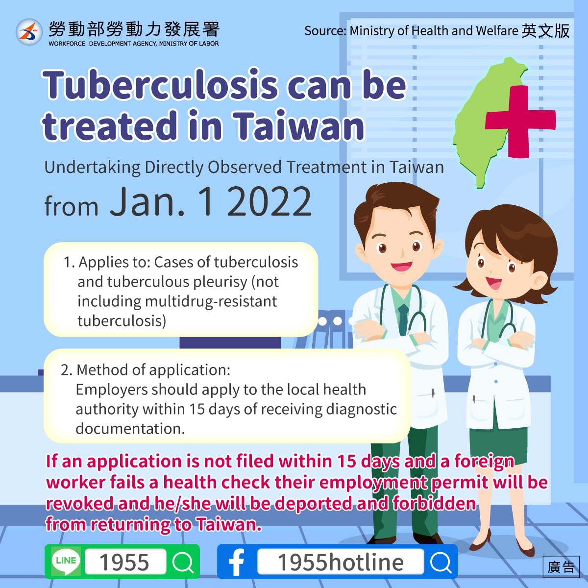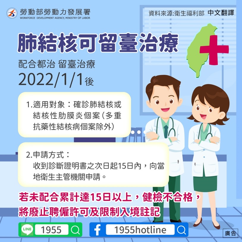 ▍配合都治 留臺治療 (2022/1/1後)1.適用對象:確診肺結核或結核性肋膜炎個案(多重抗藥性結核病個案除外)2.申請方式:雇主收到診斷證明書之次日起15日內,向當地衛生主管機關申請。* 若未配合累計達15日以上,健檢不合格,將廢止聘僱許可及限制入境註記資料來源:衛生福利部
