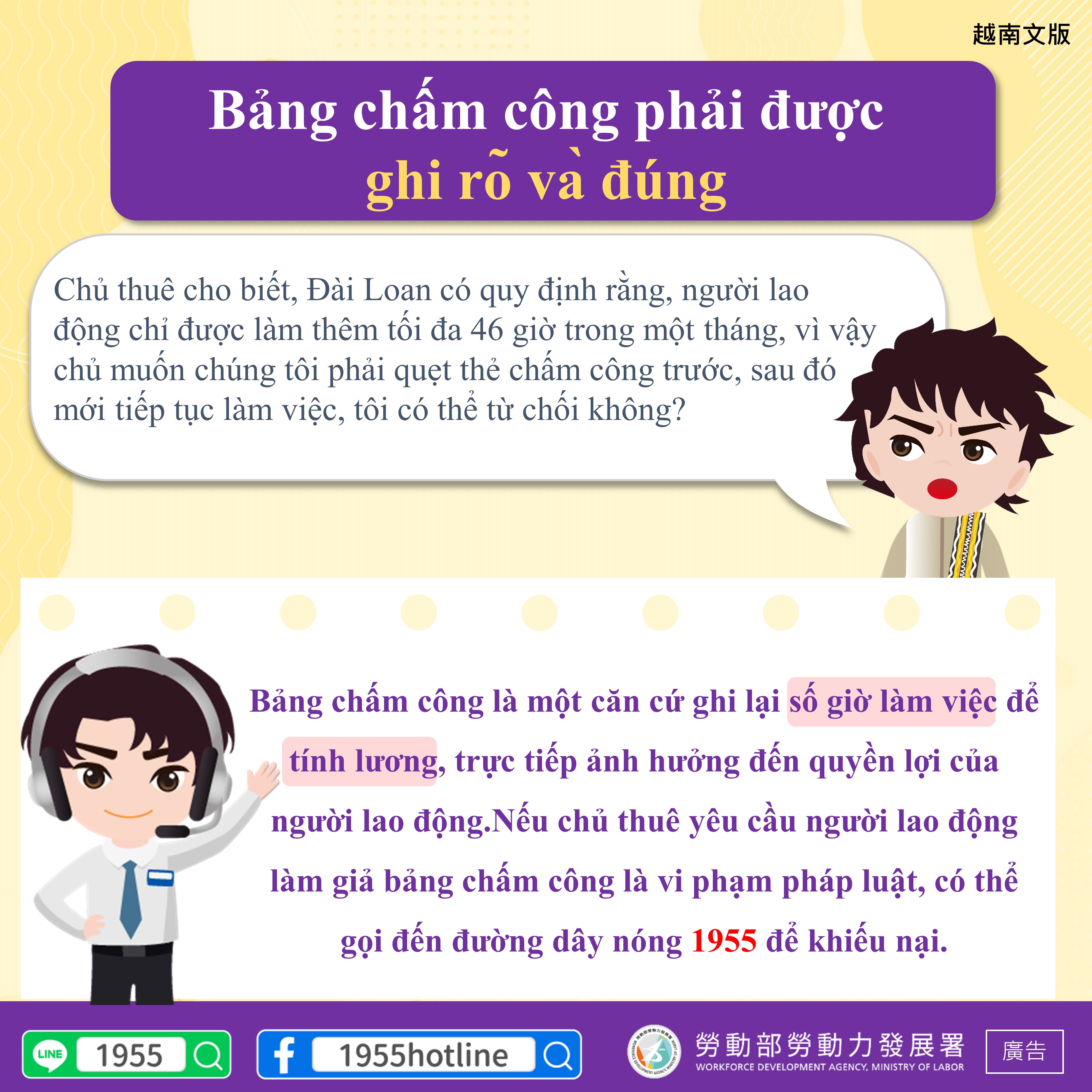 Chủ thuê cho biết, Đài Loan có quy định rằng, người lao động chỉ được làm thêm tối đa 46 giờ trong một tháng, vì vậy chủ muốn chúng tôi phải quẹt thẻ chấm công trước, sau đó mới tiếp tục làm việc, tôi có thể từ chối không?