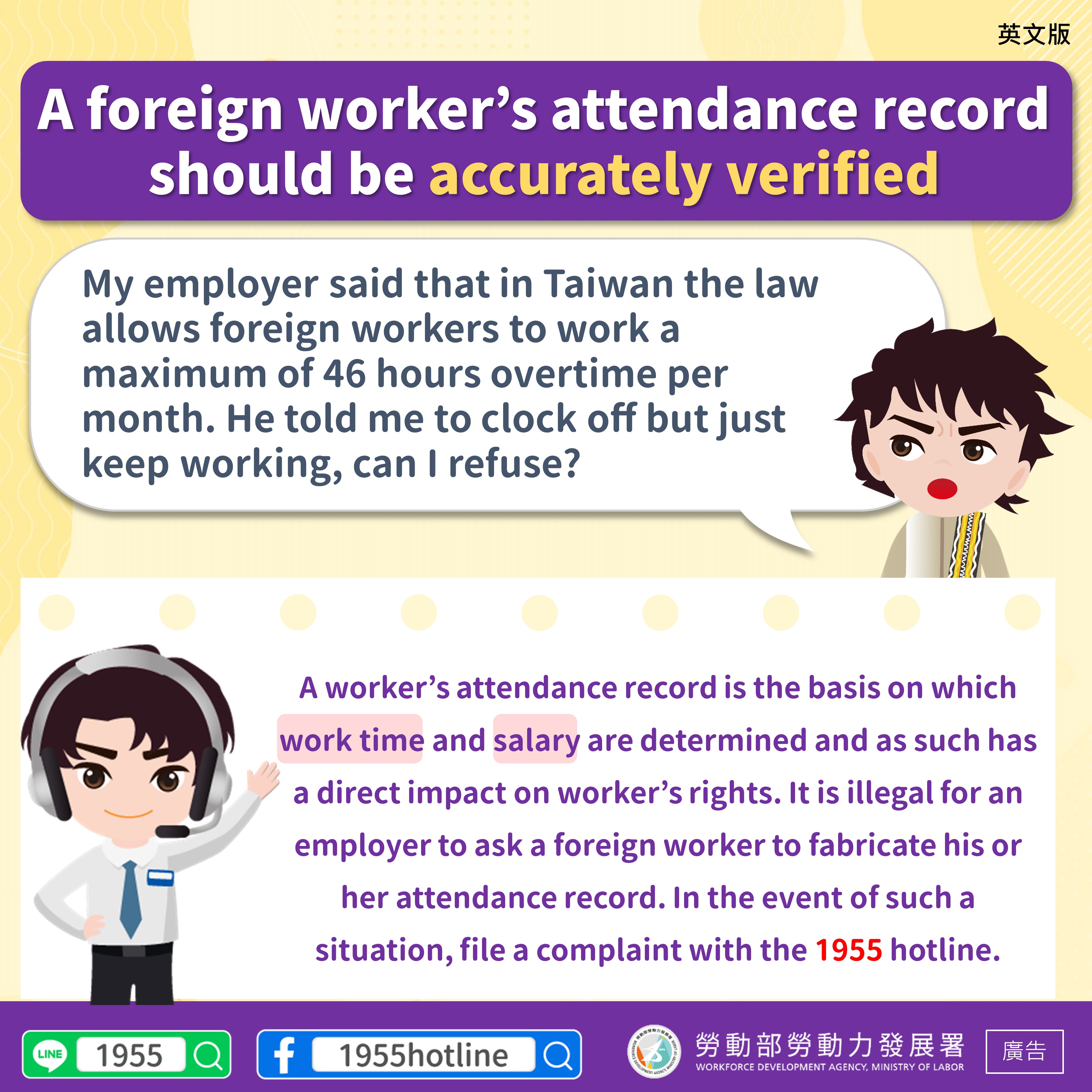 Majikan mengatakan bahwa peraturan di Taiwan mengatur para pekerja dalam 1 bulan hanya boleh lembur maksimal 46 jam saja, maka dari itu meminta kami untuk melakukan absensi barulah kami dapat lanjut bekerja. Apakah saya bisa menolak?