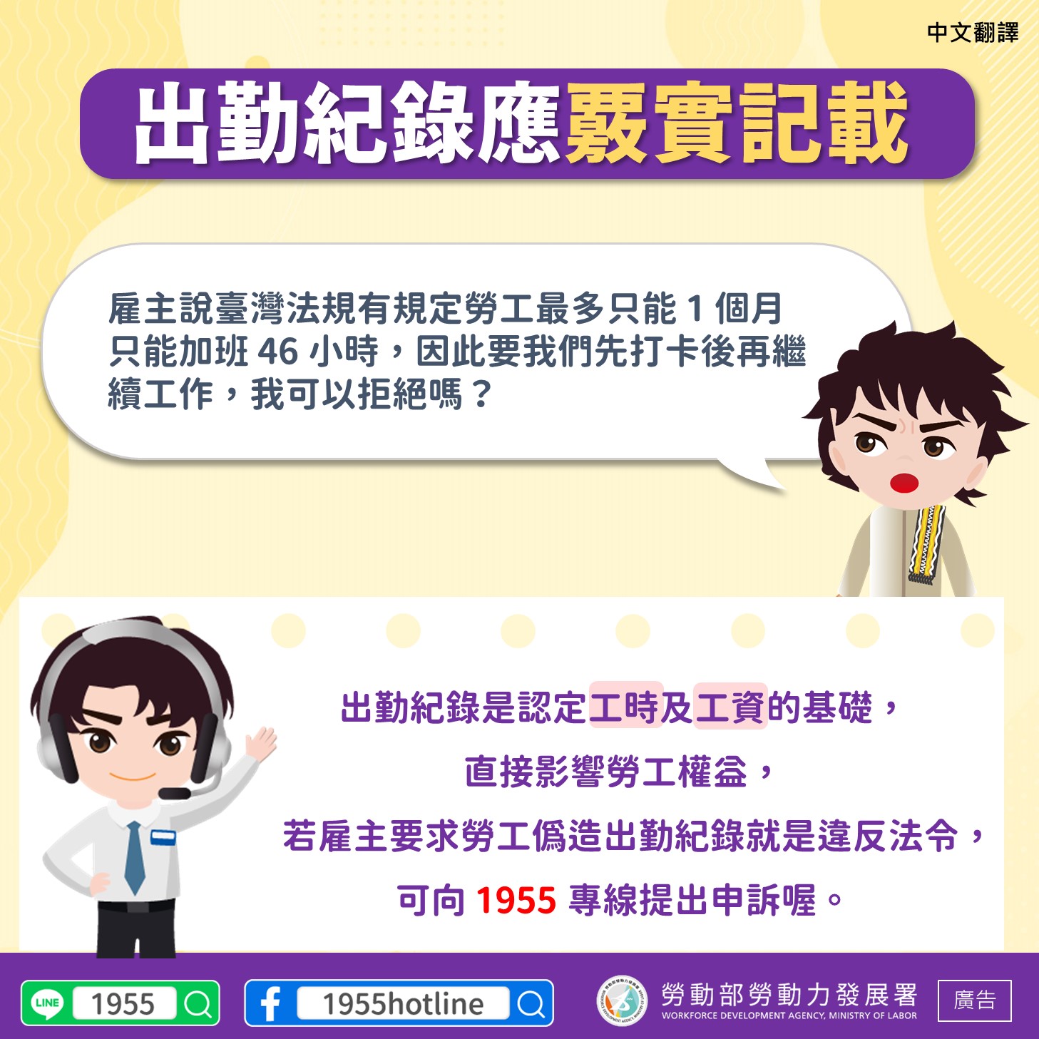 出勤紀錄是認定工時及工資的基礎,直接影響勞工權益,若雇主要求勞工偽造出勤紀錄就是違反法令,可向 1955 專線提出申訴喔。