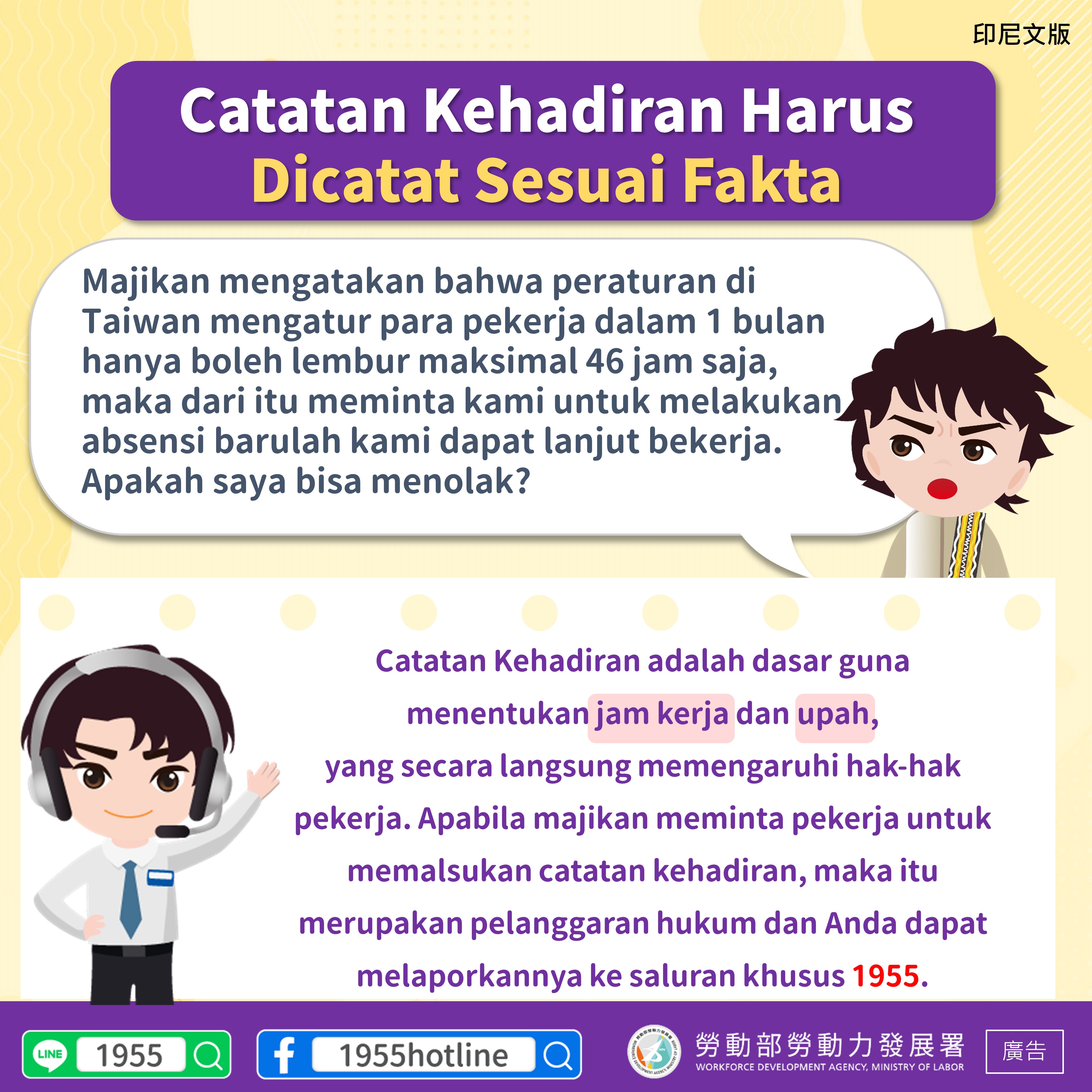 yang secara langsung memengaruhi hak-hak pekerja. Apabila majikan meminta pekerja untuk memalsukan catatan kehadiran, maka itu merupakan pelanggaran hukum dan Anda dapat melaporkannya ke saluran khusus 1955.