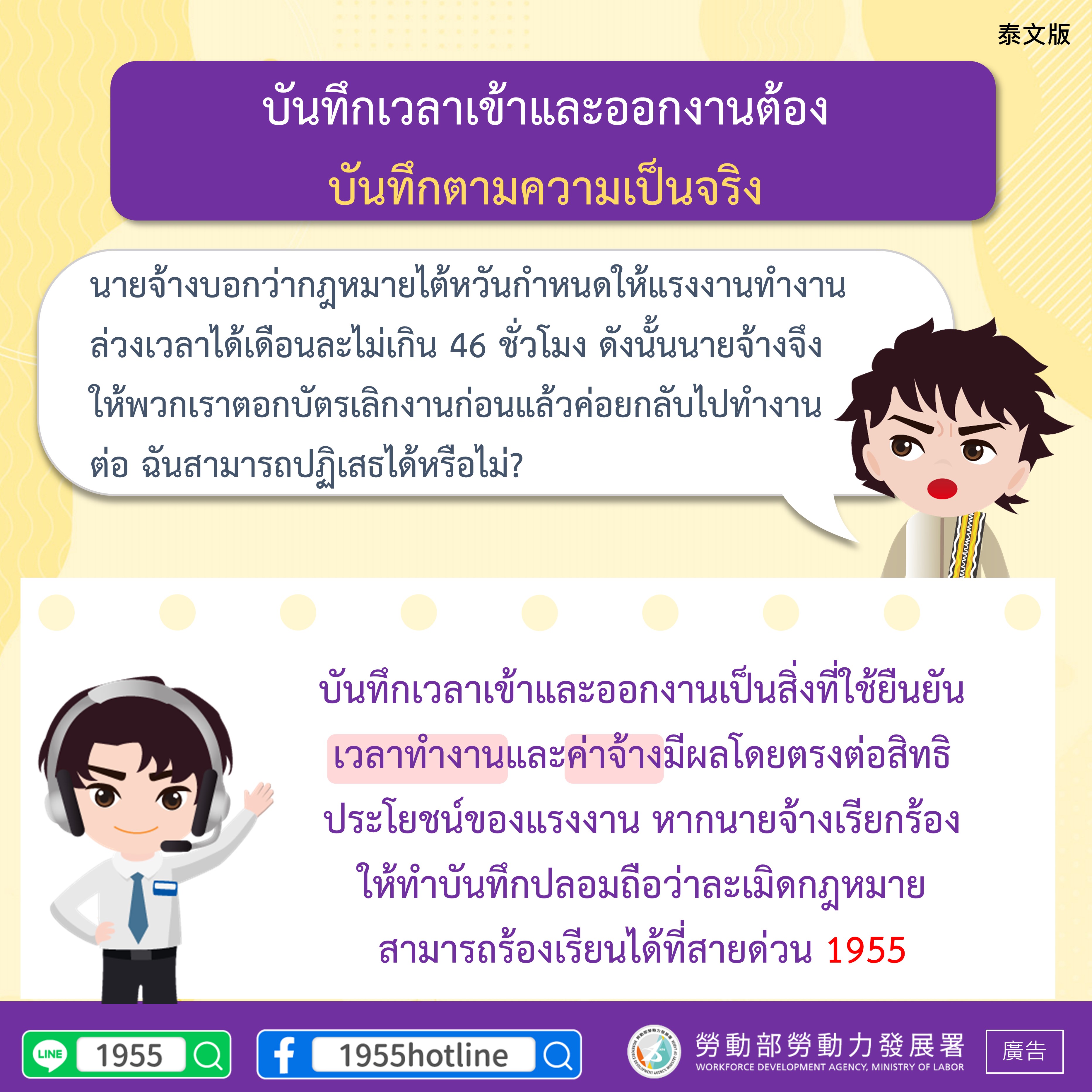 บันทึกเวลาเข้าและออกงานเป็นสิ่งที่ใช้ยืนยันเวลาทำงานและค่าจ้างมีผลโดยตรงต่อสิทธิประโยชน์ของแรงงาน หากนายจ้างเรียกร้องให้ทำบันทึกปลอมถือว่าละเมิดกฎหมายสามารถร้องเรียนได้ที่สายด่วน 1955