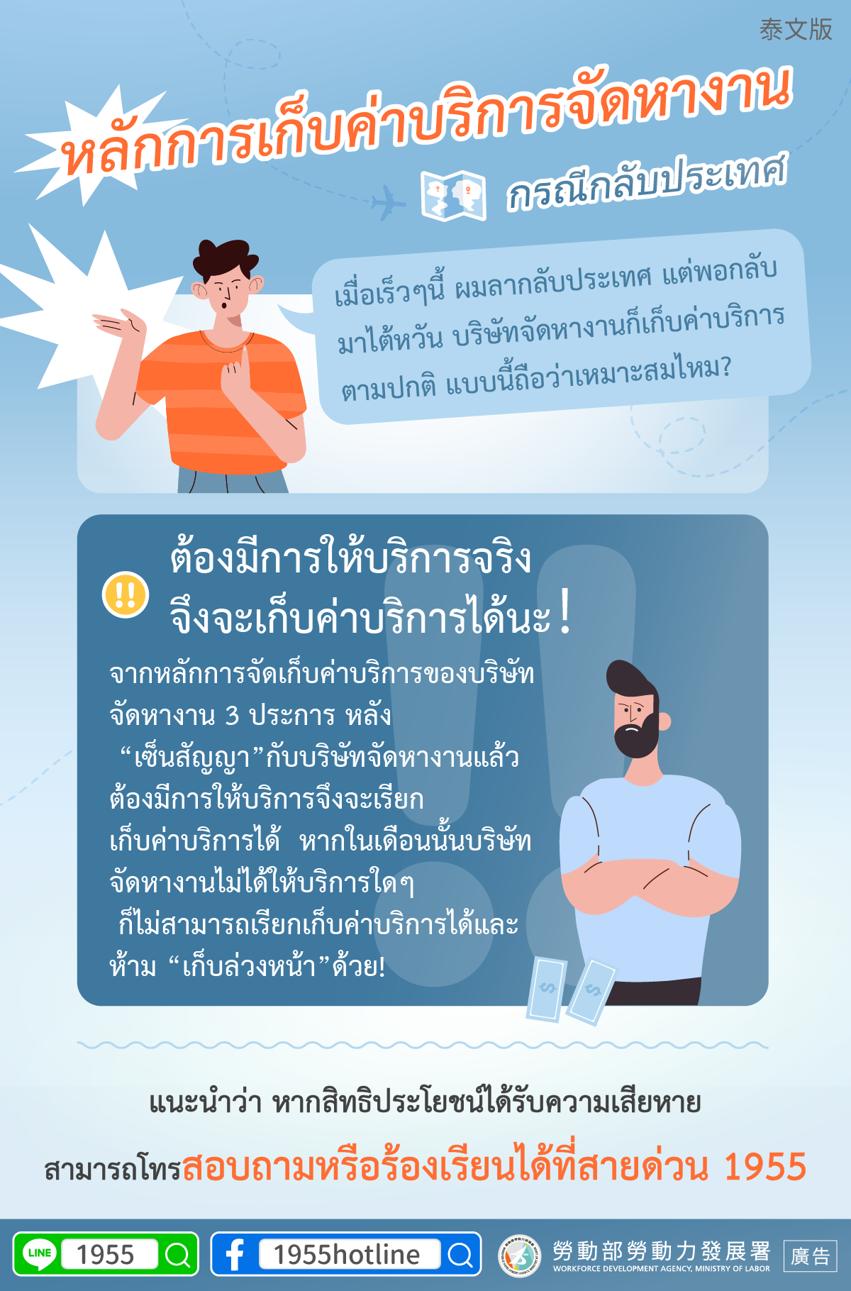 เมื่อเร็วๆนี้ ผมลากลับประเทศ แต่พอกลับมาไต้หวัน บริษัทจัดหางานก็เก็บค่าบริการตามปกติ แบบนี้ถือว่าเหมาะสมไหม?