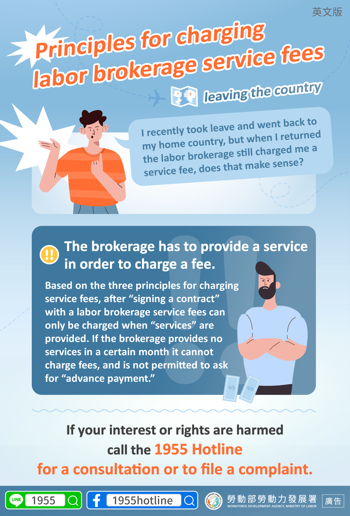Based on the three principles for charging service fees, after “signing a contract” with a labor brokerage service fees can only be charged when “services” are provided. If the brokerage provides no services in a certain month it cannot charge fees, and is not permitted to ask for “advance payment.”