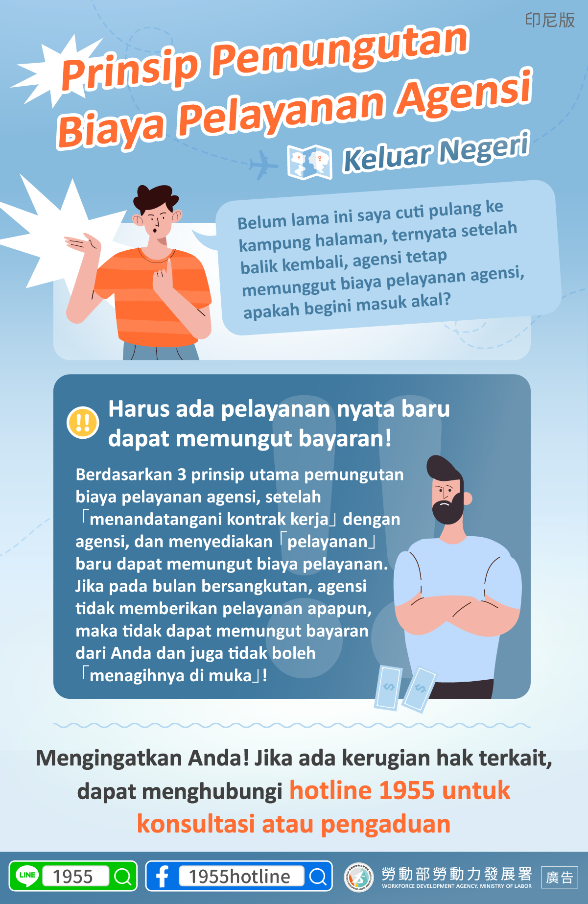 Berdasarkan 3 prinsip utama pemungutan biaya pelayanan agensi, setelah 「menandatangani kontrak kerja」 dengan agensi, dan menyediakan 「pelayanan」 baru dapat memungut biaya pelayanan. Jika pada bulan bersangkutan, agensi tidak memberikan pelayanan apapun, maka tidak dapat memungut bayaran dari Anda dan juga tidak boleh 「menagihnya di muka」!