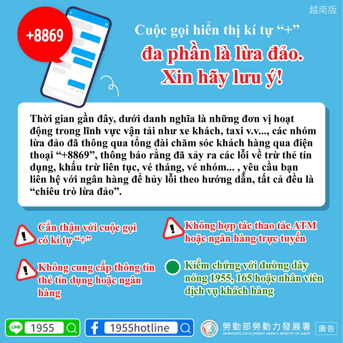 Thời gian gần đây, dưới danh nghĩa là những đơn vị hoạt động trong lĩnh vực vận tải như xe khách, taxi v.v..., các nhóm lừa đảo đã thông qua tổng đài chăm sóc khách hàng qua điện thoại “+8869”, thông báo rằng đã xảy ra các lỗi về trừ thẻ tín dụng, khấu trừ liên tục, vé tháng, vé nhóm... , yêu cầu bạn liên hệ với ngân hàng để hủy lỗi theo hướng dẫn, tất cả đều là “chiêu trò lừa đảo”.