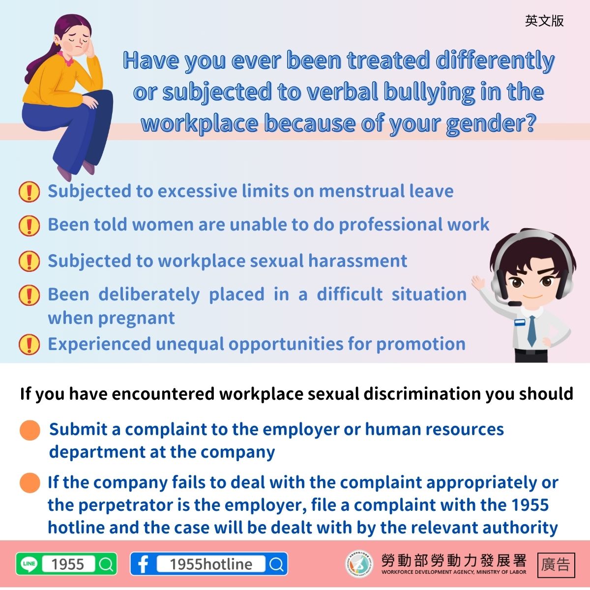 •If the company fails to deal with the complaint appropriately or the perpetrator is the employer, file a complaint with the 1955 hotline and the case will be dealt with by the relevant authority