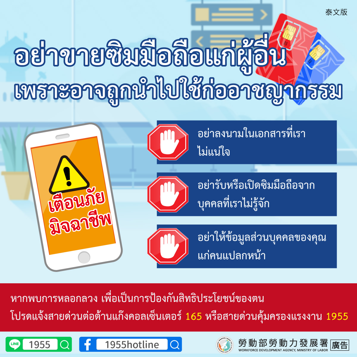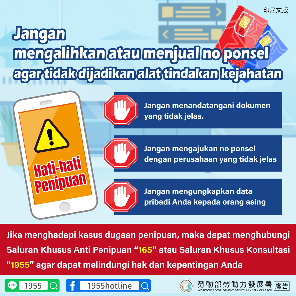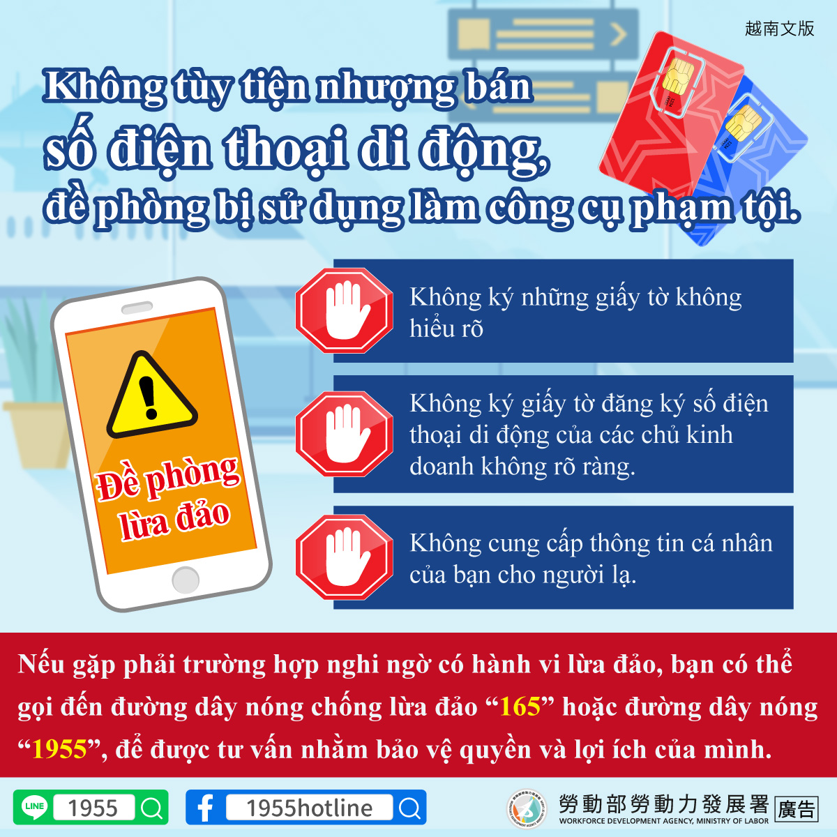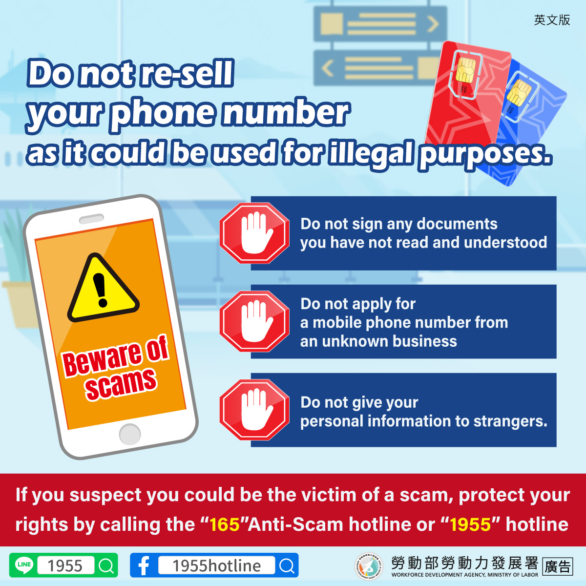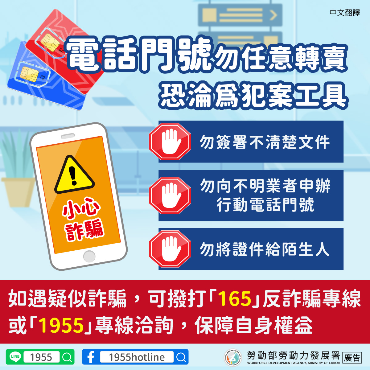 【小心詐騙】電話門號勿任意轉賣,恐淪為犯案工具請提醒移工1.勿簽署不清楚文件2.勿向不明業者申辦行動電話門號3.勿將證件給陌生人*如遇疑似詐騙,可撥打「165」反詐騙專線或「1955」專線洽詢,保障自身權益
