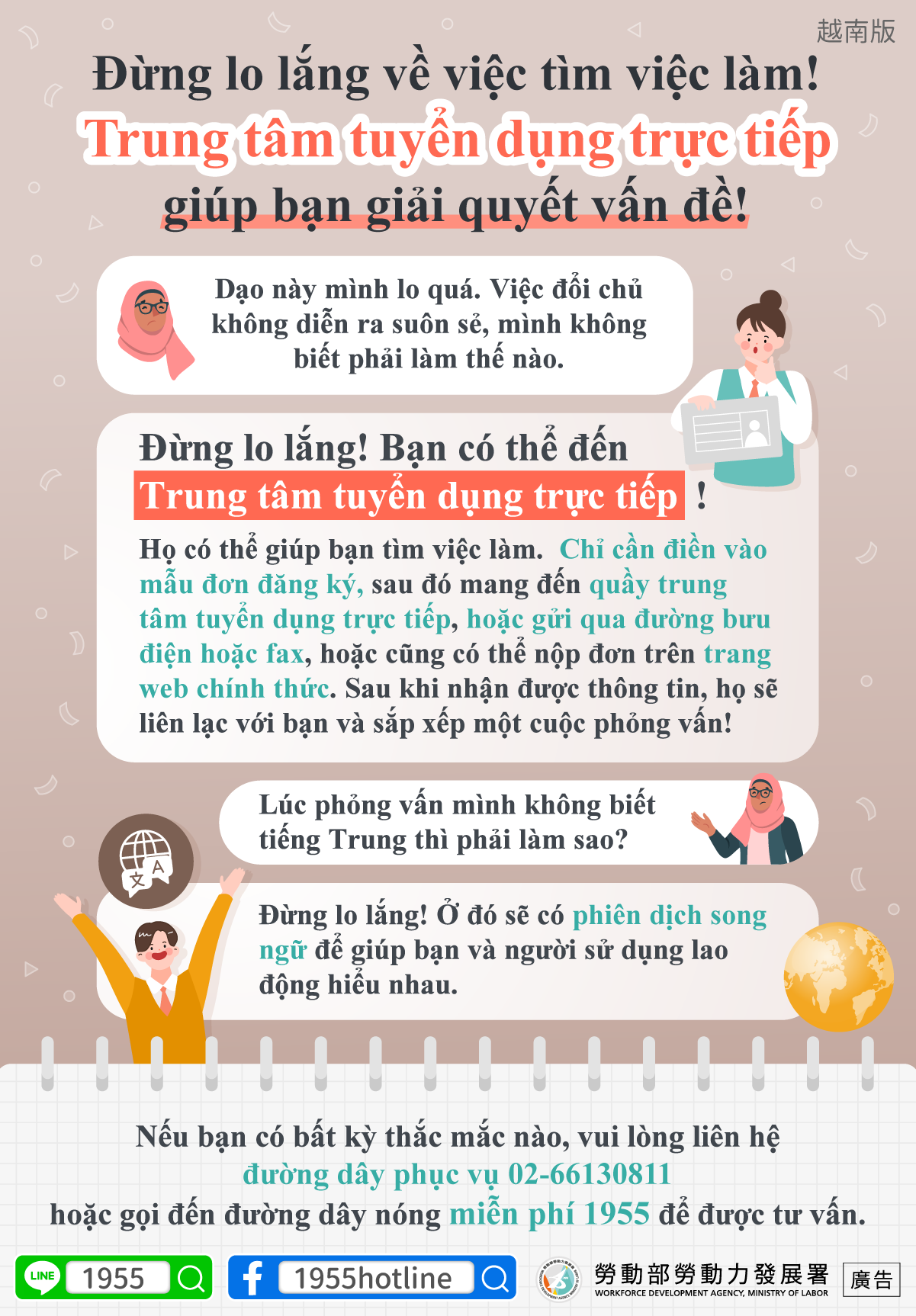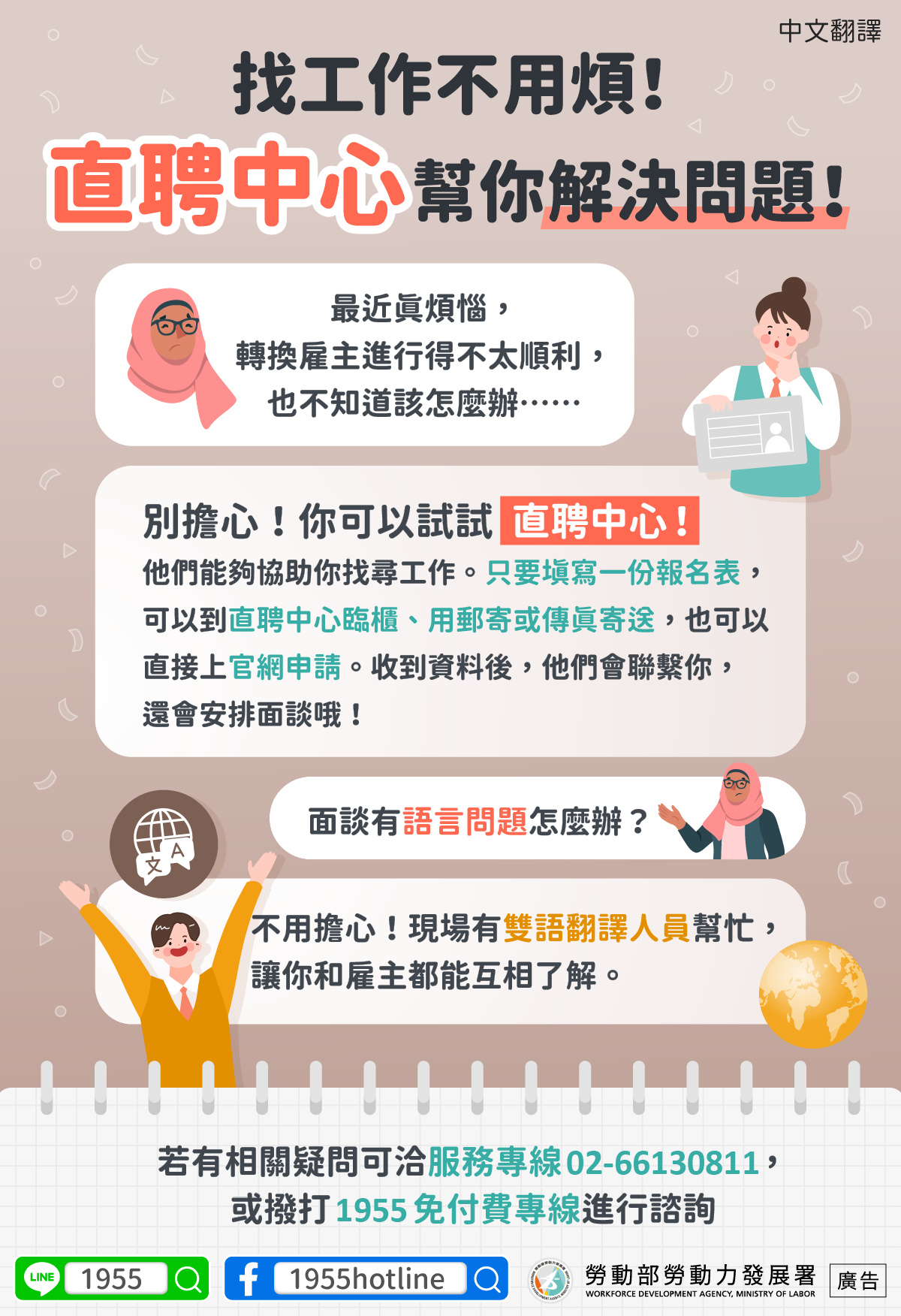 B:別擔心!你可以試試 直聘中心!他們能夠協助你找尋工作。只要填寫一份報名表,可以到直聘中心臨櫃、用郵寄或傳真寄送,也可以直接上官網申請。收到資料後,他們會聯繫你,還會安排面談哦!