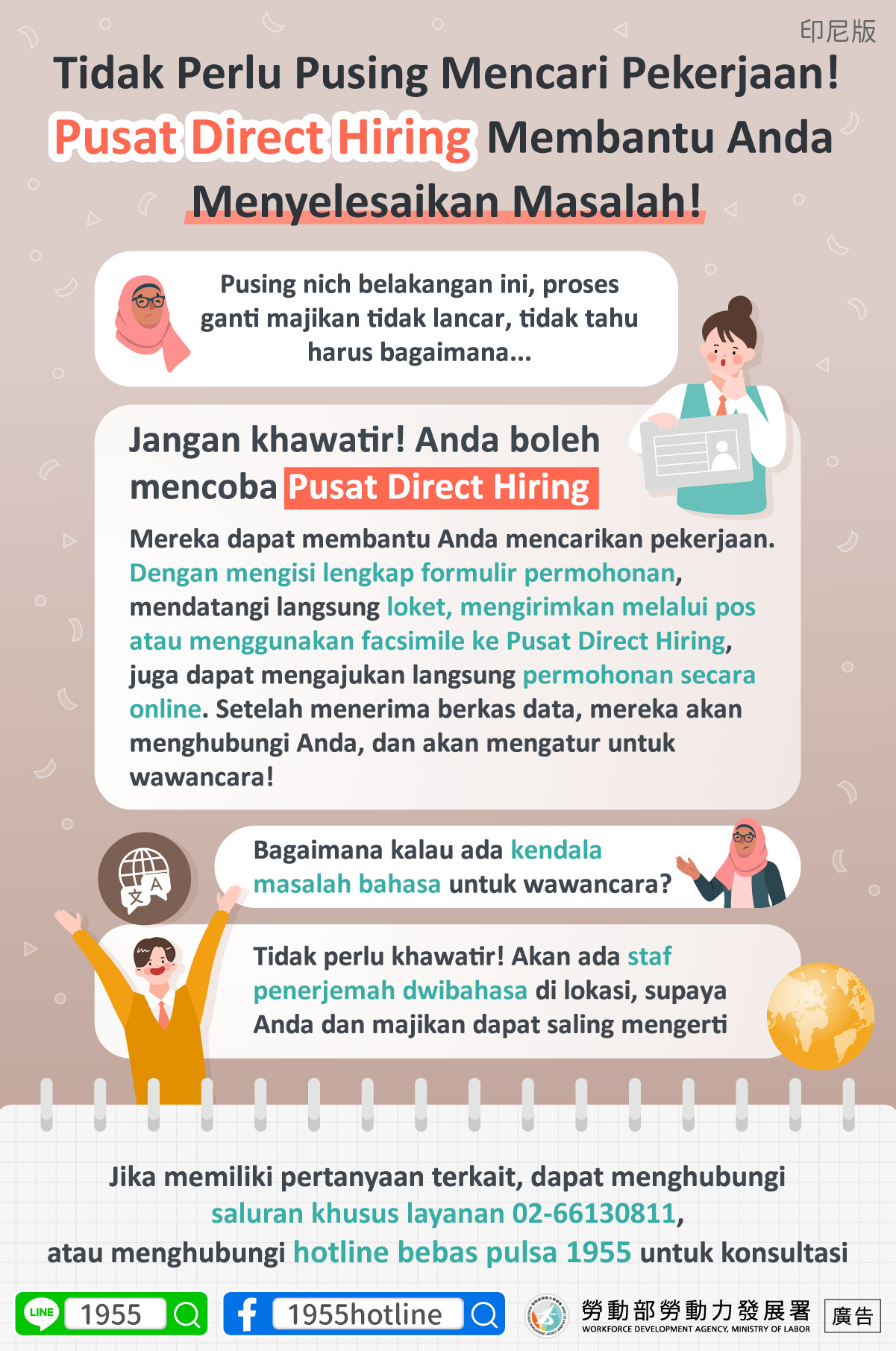 B:Jangan khawatir! Anda bolehmencoba Pusat Direct Hiring Mereka dapat membantu Anda mencarikan pekerjaan. Dengan mengisi lengkap formulir permohonan, mendatangi langsung loket, mengirimkan melalui pos atau menggunakan facsimile ke Pusat Direct Hiring, juga dapat mengajukan langsung permohonan secara online. Setelah menerima berkas data, mereka akan menghubungi Anda, dan akan mengatur untuk wawancara!