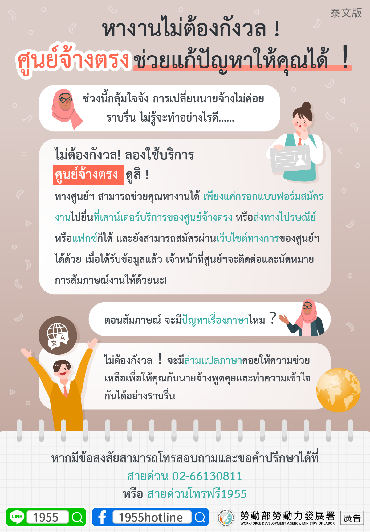 B:ไม่ต้องกังวล! ลองใช้บริการศูนย์จ้างตรง ดูสิ !ทางศูนย์ฯ สามารถช่วยคุณหางานได้ เพียงแค่กรอกแบบฟอร์มสมัครงานไปยื่นที่เคาน์เตอร์บริการของศูนย์จ้างตรง หรือส่งทางไปรษณีย์หรือแฟกซ์ก็ได้ และยังสามารถสมัครผ่านเว็บไซต์ทางการของศูนย์ฯได้ด้วย เมื่อได้รับข้อมูลแล้ว เจ้าหน้าที่ศูนย์ฯจะติดต่อและนัดหมายการสัมภาษณ์งานให้ด้วยนะ!