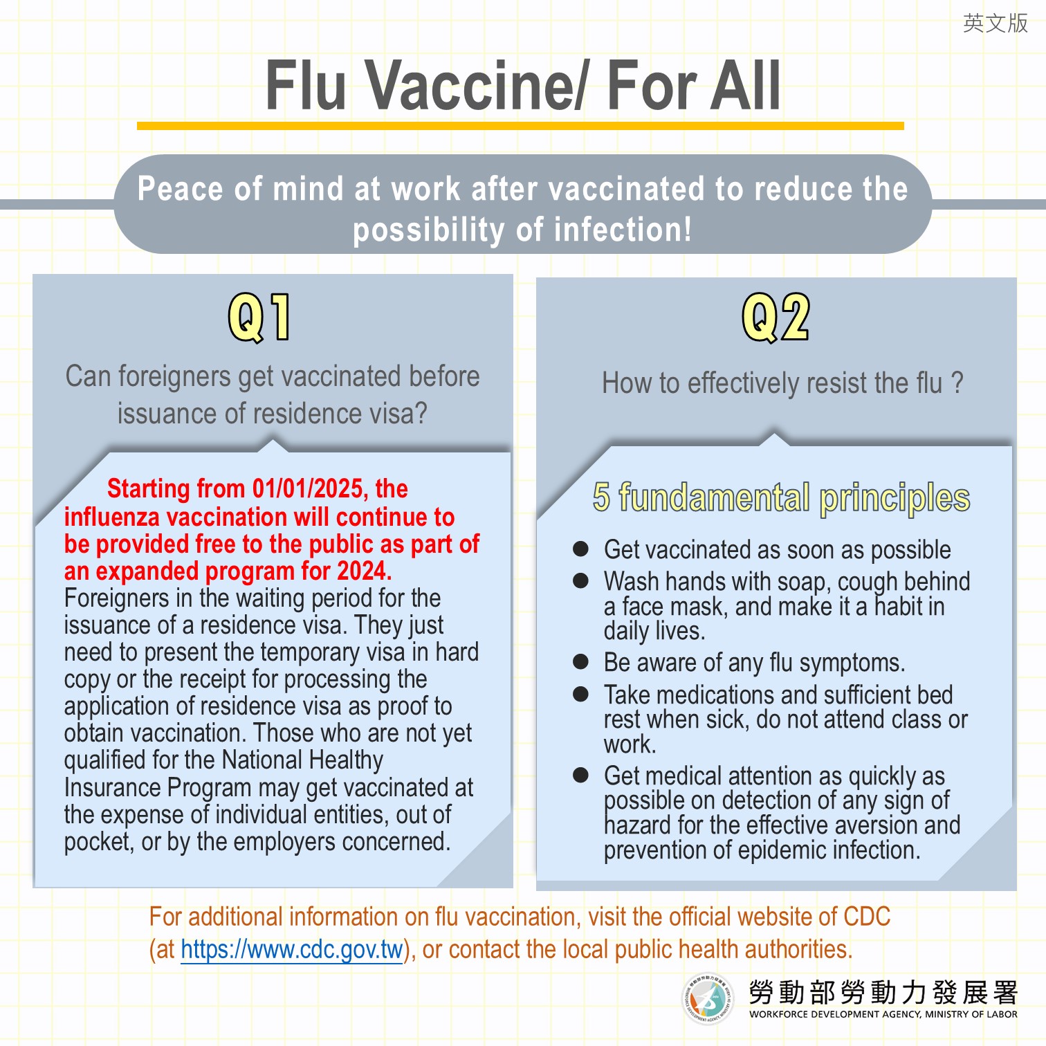 Simula sa 01/01/2025, ang Influenza Vaccination ay patuloy na ibibigay ng libre sa publiko, ito ay pinalawak na programa sa panahon ng 2024, kahit na sa panahon ng paghihintay ng mga dayuhan sa pag-iisyu ng Alien Residence Certificate, ay maaaring gamitin ang pansamantalang papel na permit sa paninirahan o ang resibo sa pag-aplay sa permit sa paninirahan bilang patunay para sa pagbabakuna sa trangkaso; gayunpaman, para sa mga hindi kwalipikado para sa national health insurance, ang bayad sa paggamot sa bakuna ay dapat pasanin ng institusyon o binabayaran ng indibidwal o sasakupin ng yunit ng pagbabakuna.