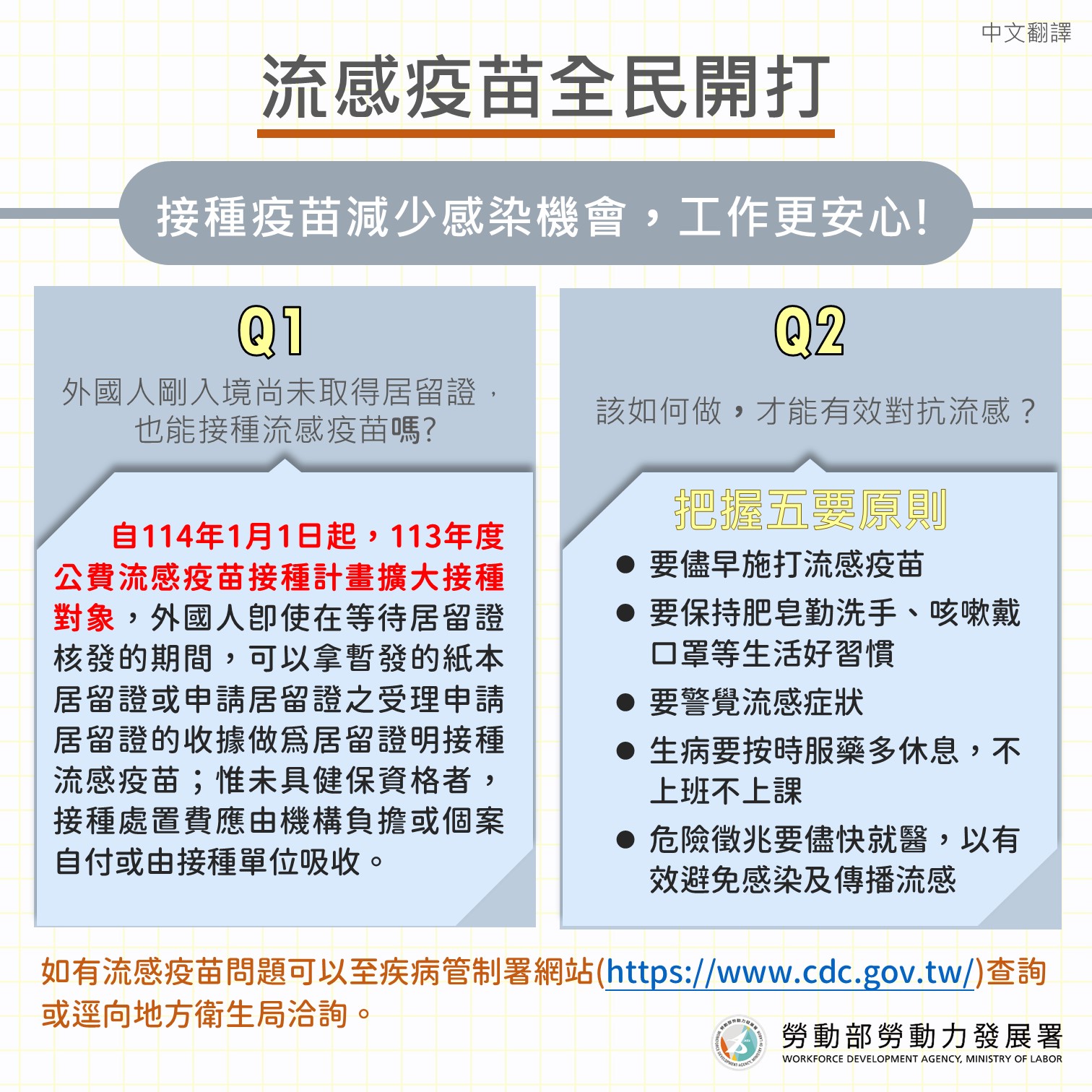 自114年1月1日起,113年度公費流感疫苗接種計畫擴大接種對象,外國人即使在等待居留證核發的期間,可以拿暫發的紙本居留證或申請居留證之受理申請居留證的收據做為居留證明接種流感疫苗;惟未具健保資格者,接種處置費應由機構負擔或個案自付或由接種單位吸收。