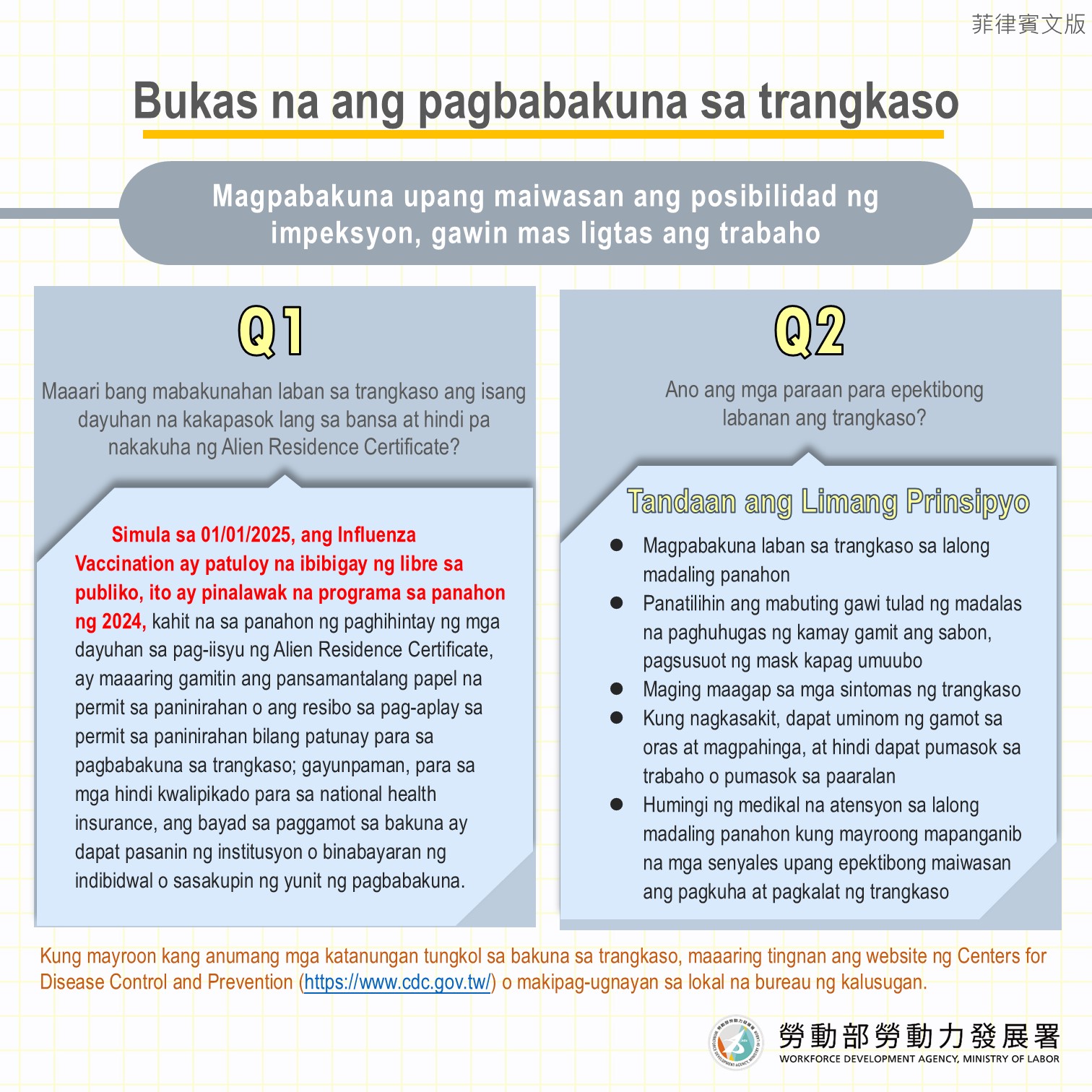 Kung mayroon kang anumang mga katanungan tungkol sa bakuna sa trangkaso, maaaring tingnan ang website ng Centers for Disease Control and Prevention (https://www.cdc.gov.tw/) o makipag-ugnayan sa lokal na bureau ng kalusugan.