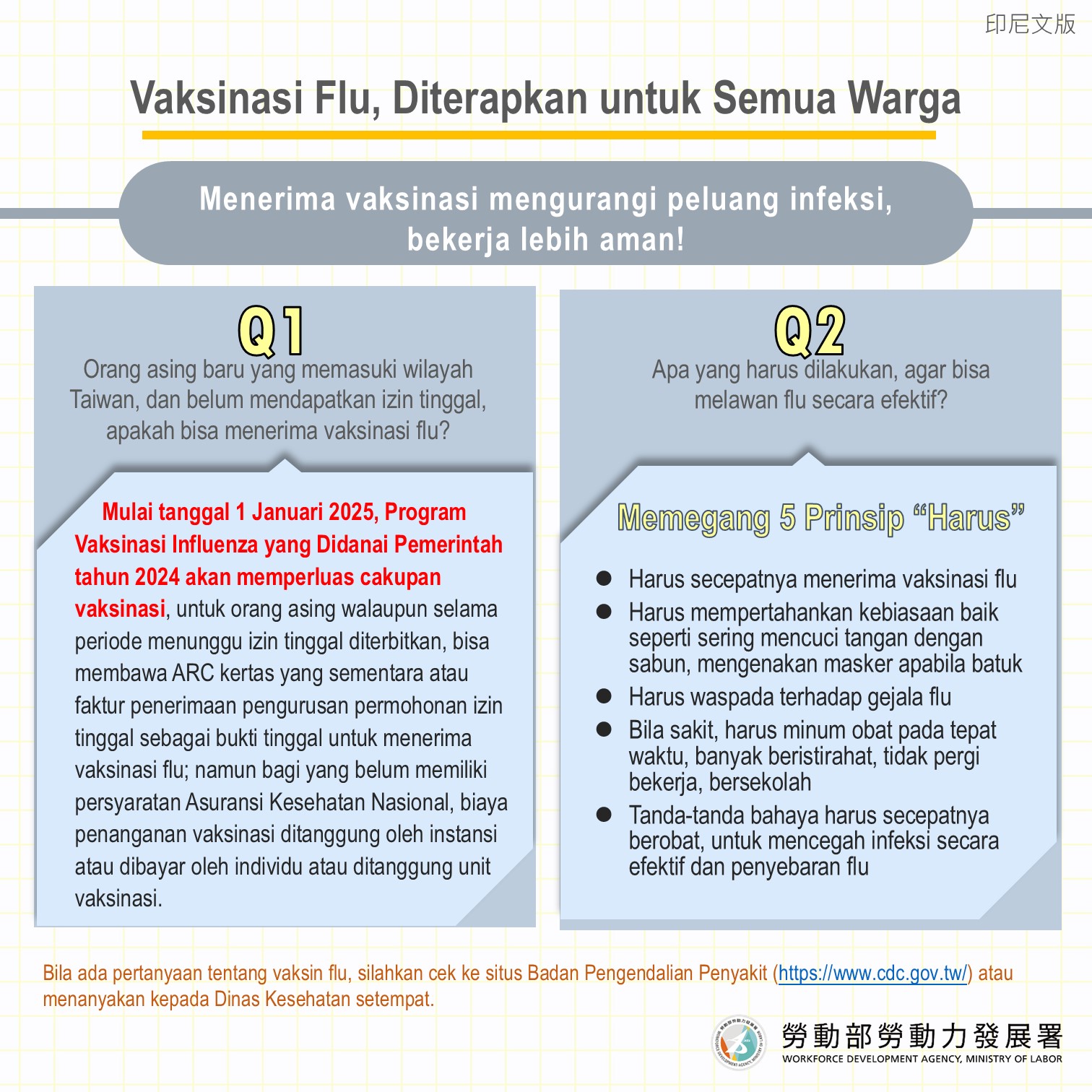 Bila ada pertanyaan tentang vaksin flu, silahkan cek ke situs Badan Pengendalian Penyakit (https://www.cdc.gov.tw/) atau menanyakan kepada Dinas Kesehatan setempat.