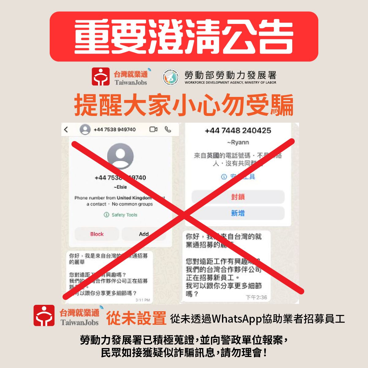 澄清⚠️澄清⚠️台灣就業通未透過WhatsApp協助業者招募員工,呼籲民眾小心別受騙!⚠️