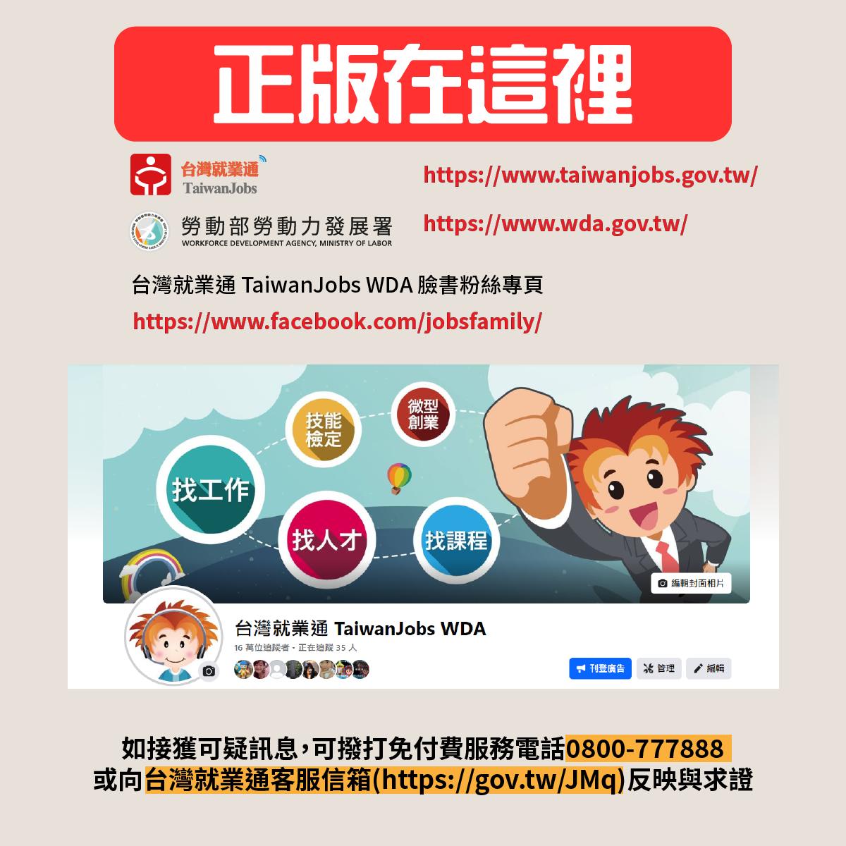 民眾如接獲此類疑似詐騙訊息,請勿理會,可撥打免付費服務電話0800-777888或向台灣就業通客服信箱(https://gov.tw/JMq)反映與求證。