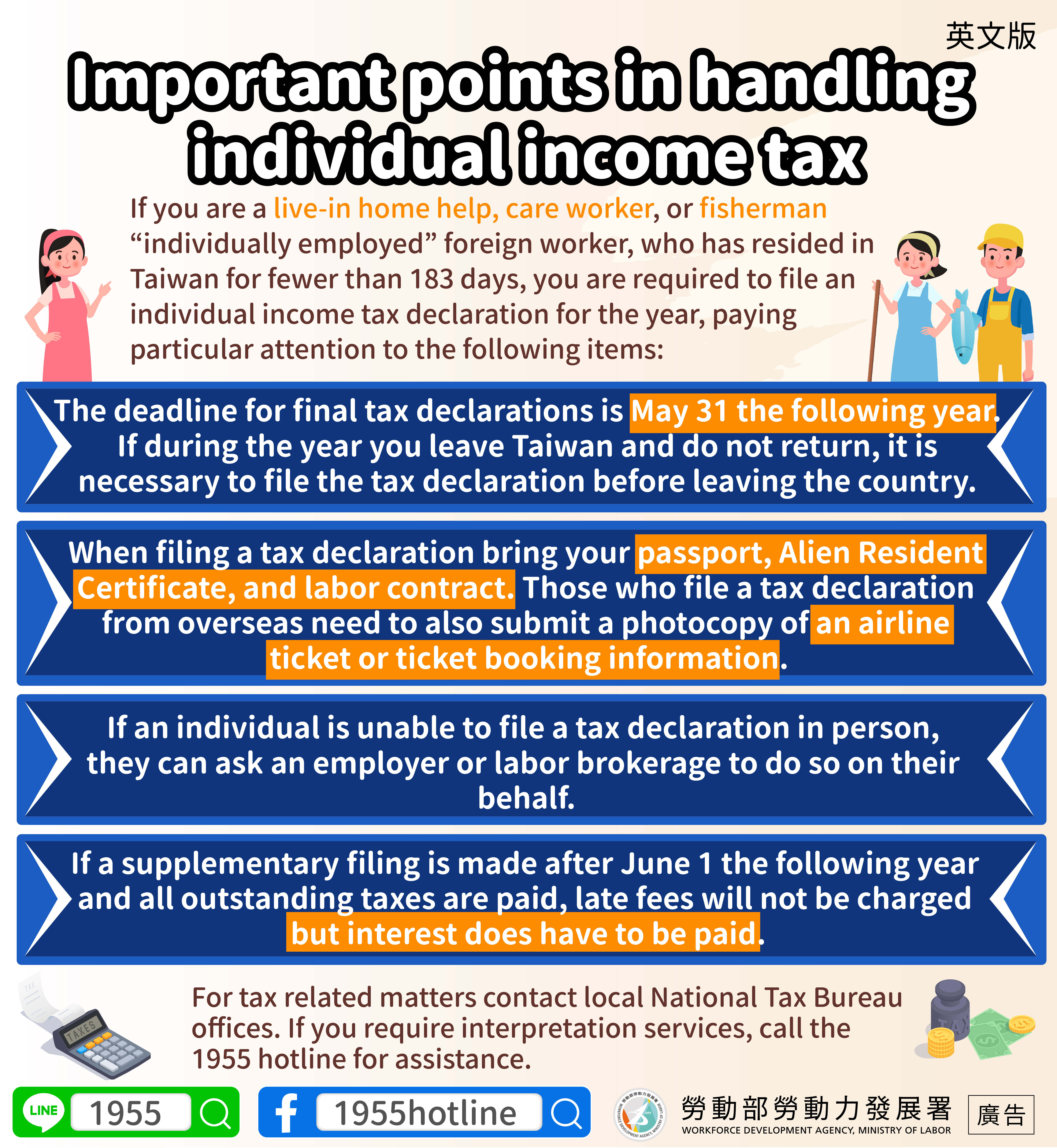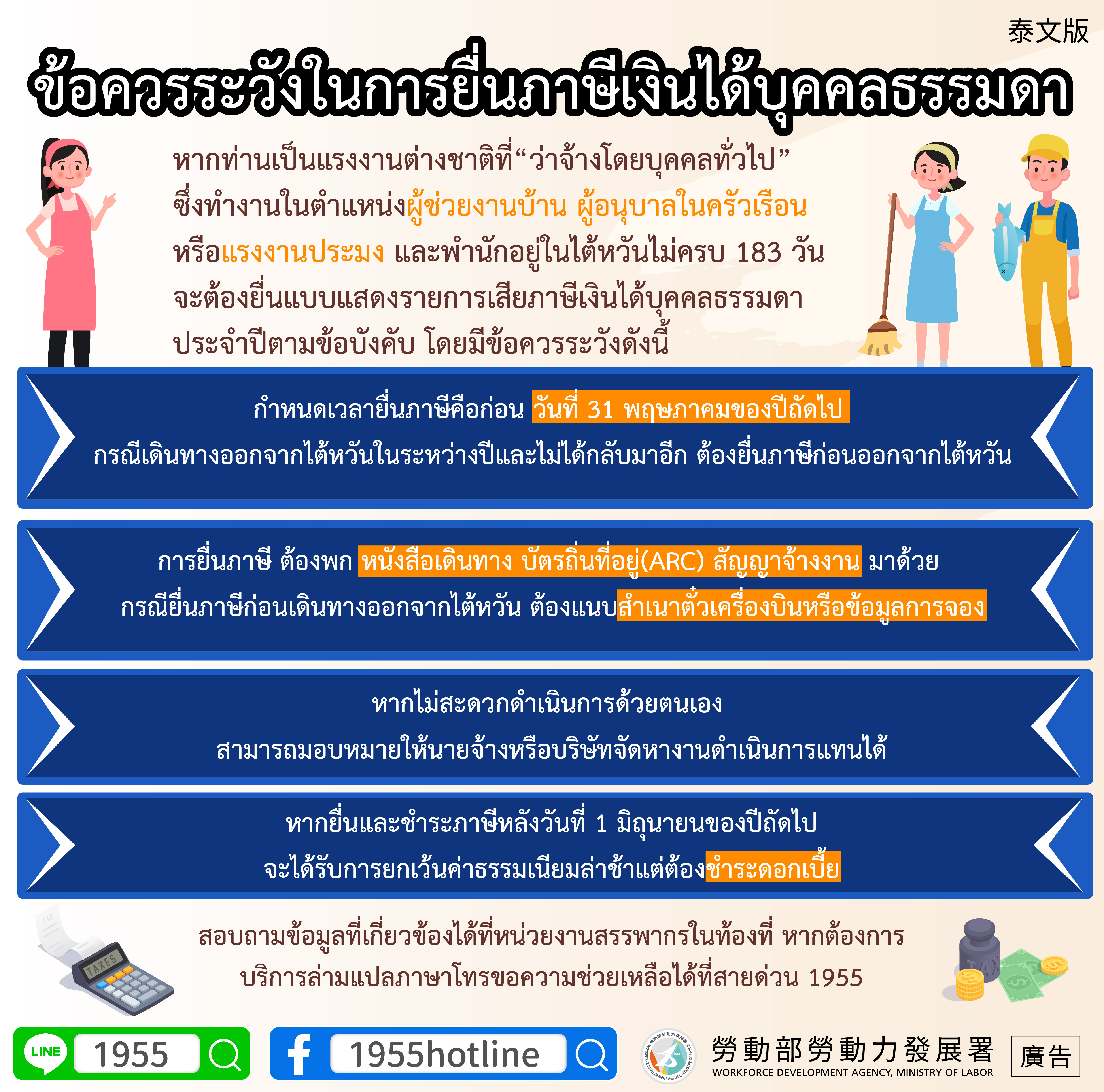 หากท่านเป็นแรงงานต่างชาติที่“ว่าจ้างโดยบุคคลทั่วไป” ซึ่งทำงานในตำแหน่งผู้ช่วยงานบ้าน ผู้อนุบาลในครัวเรือน หรือแรงงานประมง และพำนักอยู่ในไต้หวันไม่ครบ 183 วัน จะต้องยื่นแบบแสดงรายการเสียภาษีเงินได้บุคคลธรรมดาประจำปีตามข้อบังคับ โดยมีข้อควรระวังดังนี้