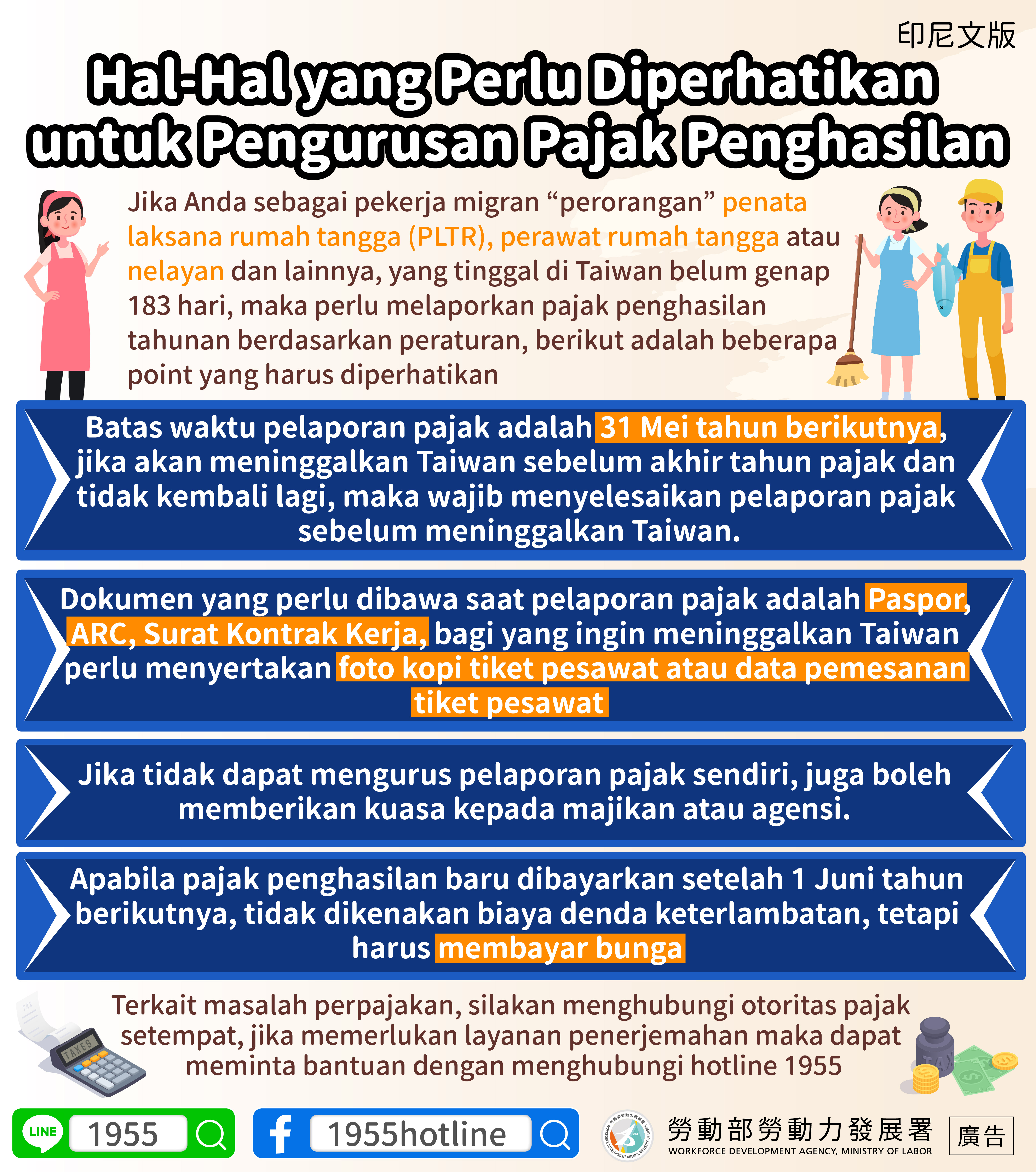 Jika Anda sebagai pekerja migran “perorangan” penata laksana rumah tangga (PLTR), perawat rumah tangga atau nelayan dan lainnya, yang tinggal di Taiwan belum genap 183 hari, maka perlu melaporkan pajak penghasilan tahunan berdasarkan peraturan, berikut adalah beberapa point yang harus diperhatikan