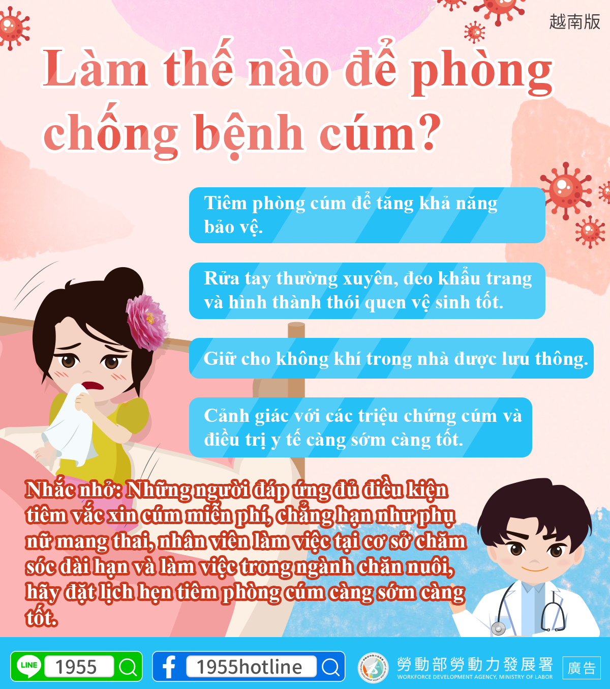 Nhắc nhở: Những người đáp ứng đủ điều kiện tiêm vắc xin cúm miễn phí, chẳng hạn như phụ nữ mang thai, nhân viên làm việc tại cơ sở chăm sóc dài hạn và làm việc trong ngành chăn nuôi, hãy đặt lịch hẹn tiêm phòng cúm càng sớm càng tốt.
