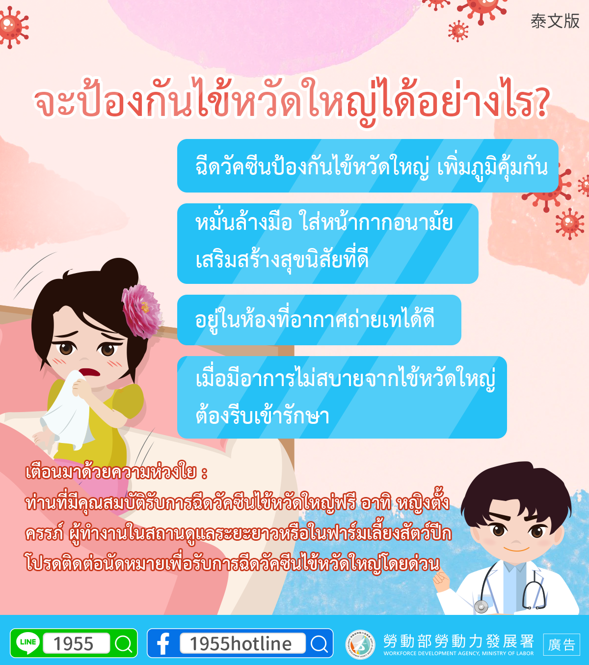 ท่านที่มีคุณสมบัติรับการฉีดวัคซีนไข้หวัดใหญ่ฟรี อาทิ หญิงตั้งครรภ์ ผู้ทำงานในสถานดูแลระยะยาวหรือในฟาร์มเลี้ยงสัตว์ปีก โปรดติดต่อนัดหมายเพื่อรับการฉีดวัคซีนไข้หวัดใหญ่โดยด่วน