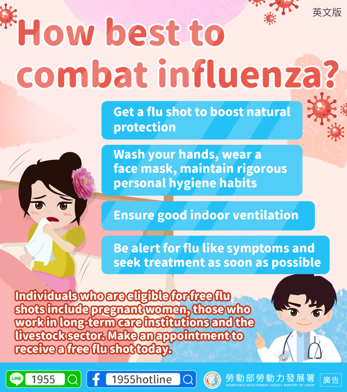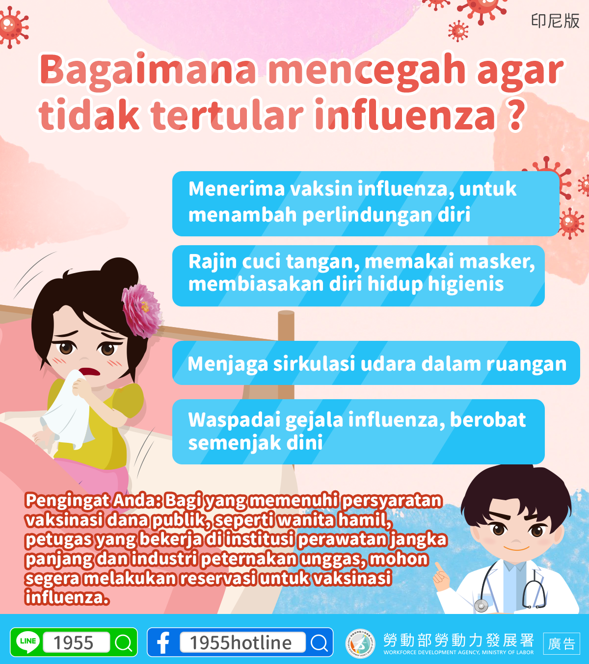 Pengingat Anda: Bagi yang memenuhi persyaratan vaksinasi dana publik, seperti wanita hamil, petugas yang bekerja di institusi perawatan jangka panjang dan industri peternakan unggas, mohon segera melakukan reservasi untuk vaksinasi influenza.