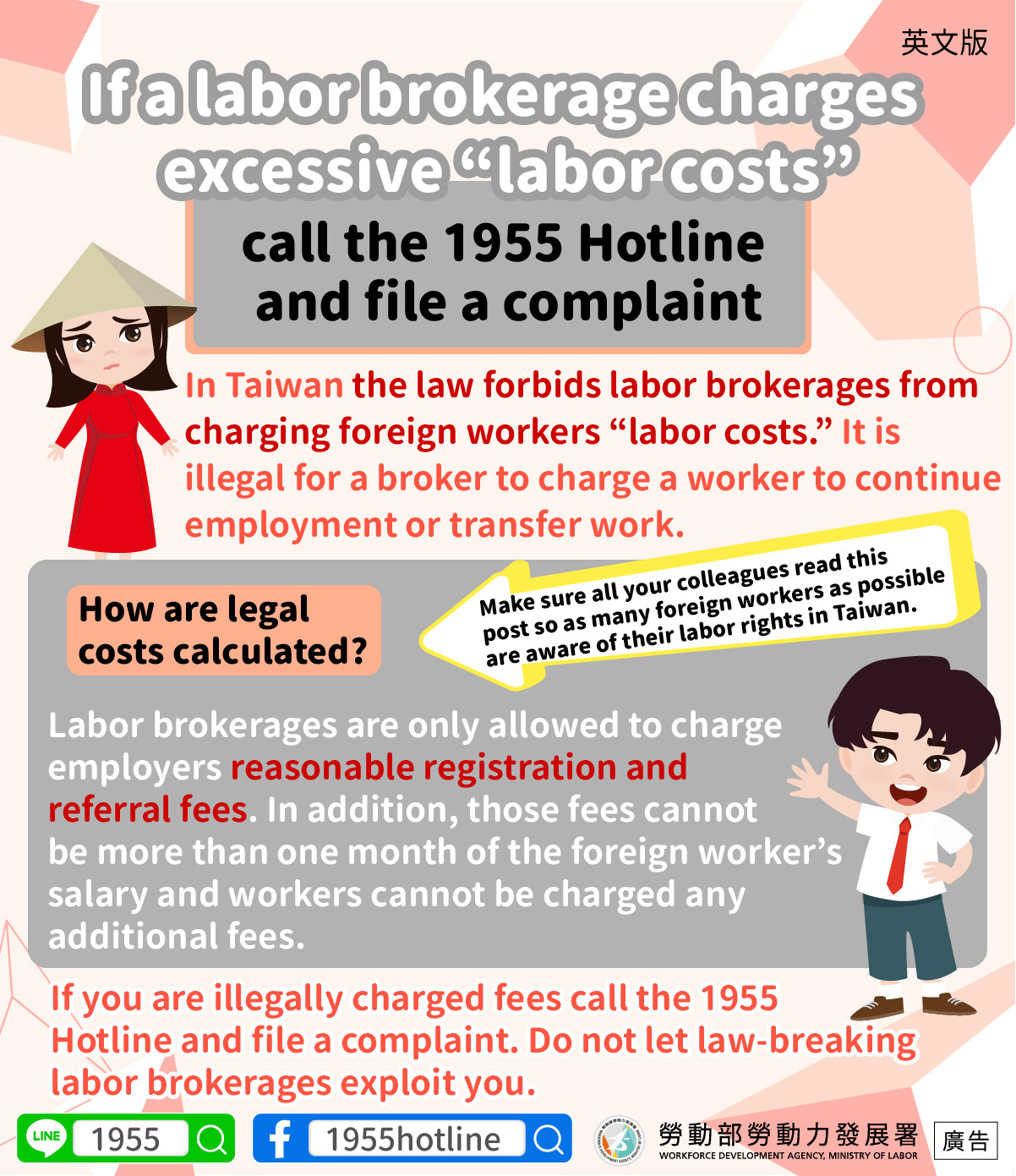 In Taiwan the law forbids labor brokerages from charging foreign workers “labor costs.” It is illegal for a broker to charge a worker to continue employment or transfer work.