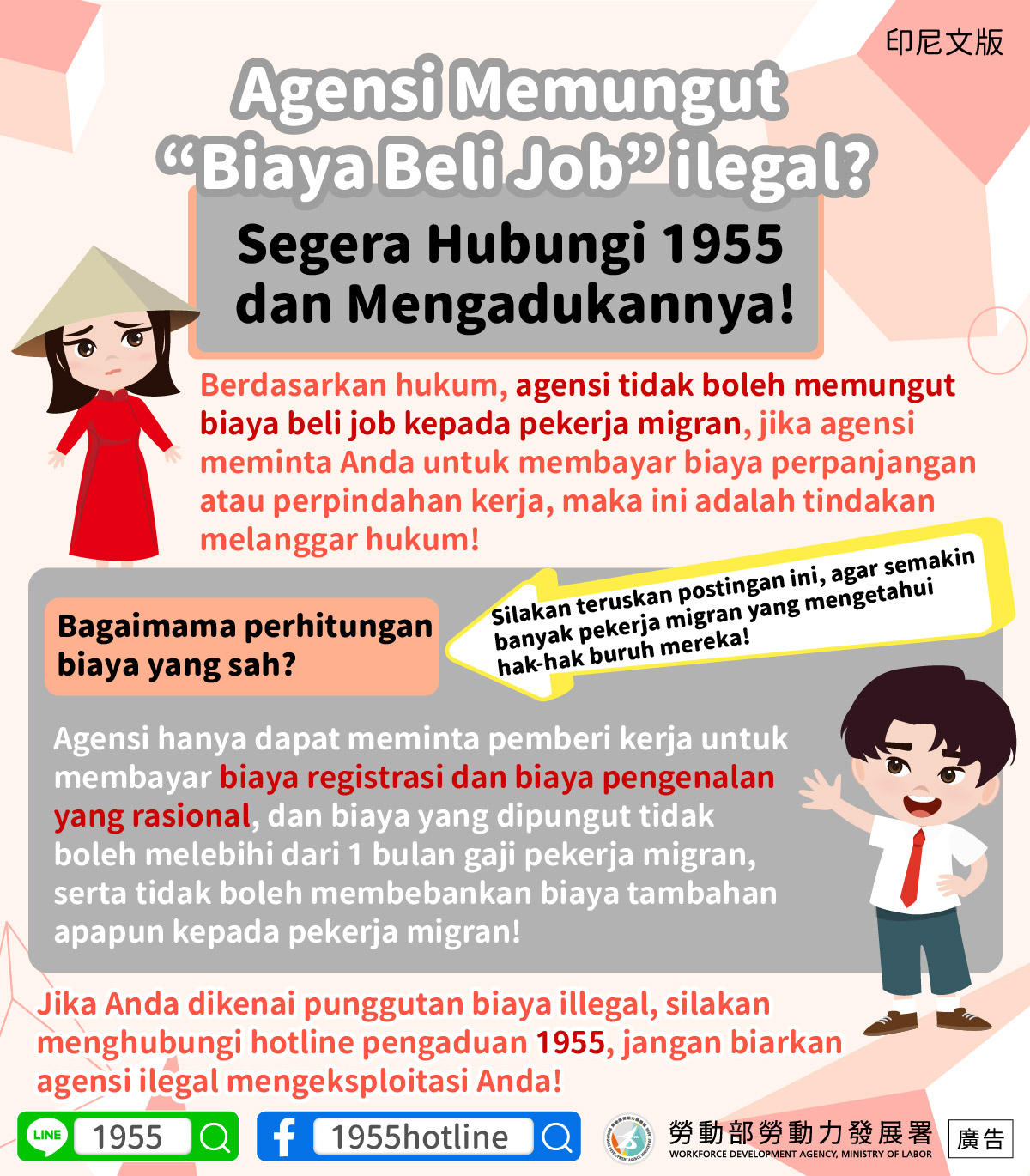 Jika Anda dikenai punggutan biaya illegal, silakan menghubungi hotline pengaduan 1955, jangan biarkan agensi ilegal mengeksploitasi Anda!
