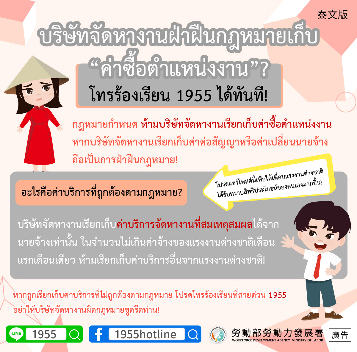 หากถูกเรียกเก็บค่าบริการที่ไม่ถูกต้องตามกฎหมาย โปรดโทรร้องเรียนที่สายด่วน 1955 อย่าให้บริษัทจัดหางานผิดกฎหมายขูดรีดท่าน!