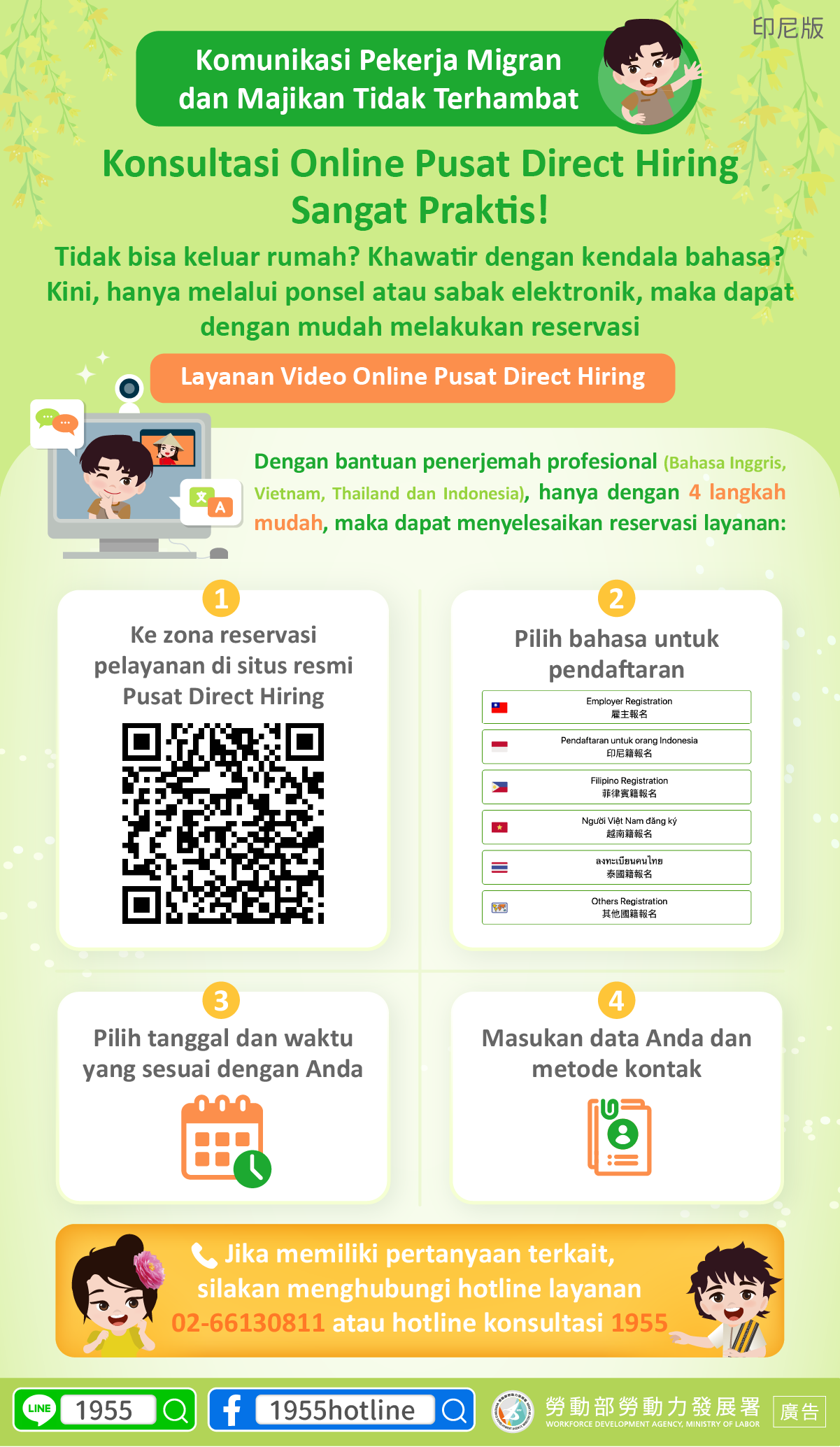 Tidak bisa keluar rumah? Khawatir dengan kendala bahasa? Kini, hanya melalui ponsel atau sabak elektronik, maka dapat dengan mudah melakukan reservasi Layanan Video Online Pusat Direct Hiring