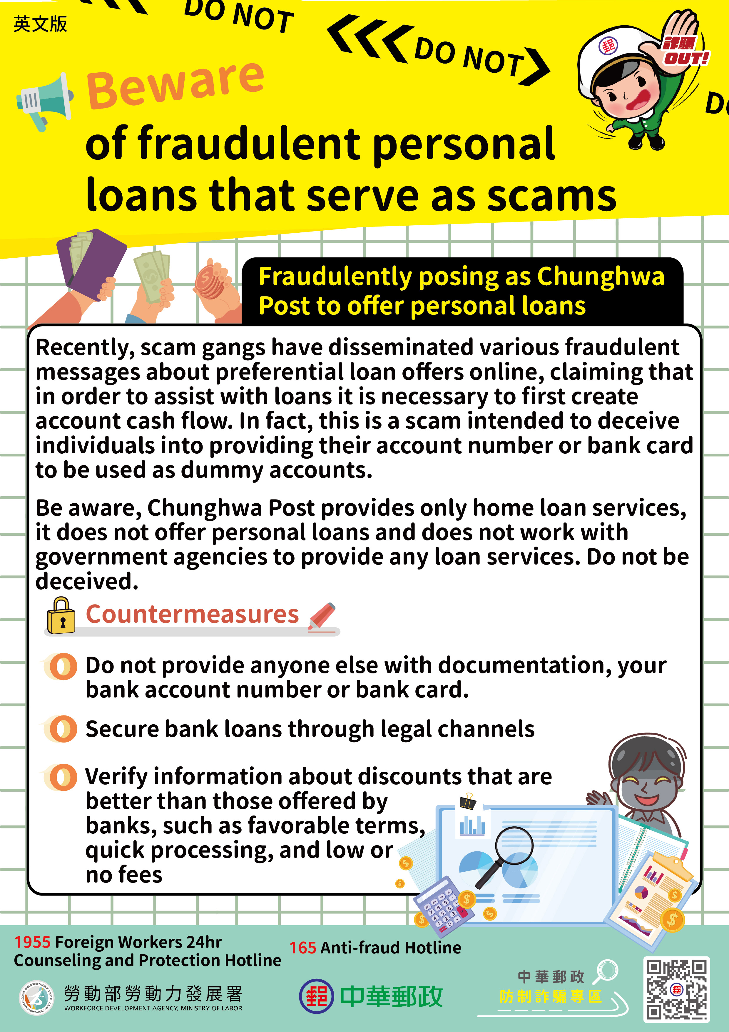 Be aware, Chunghwa Post provides only home loan services, it does not offer personal loans and does not work with government agencies to provide any loan services. Do not be deceived.