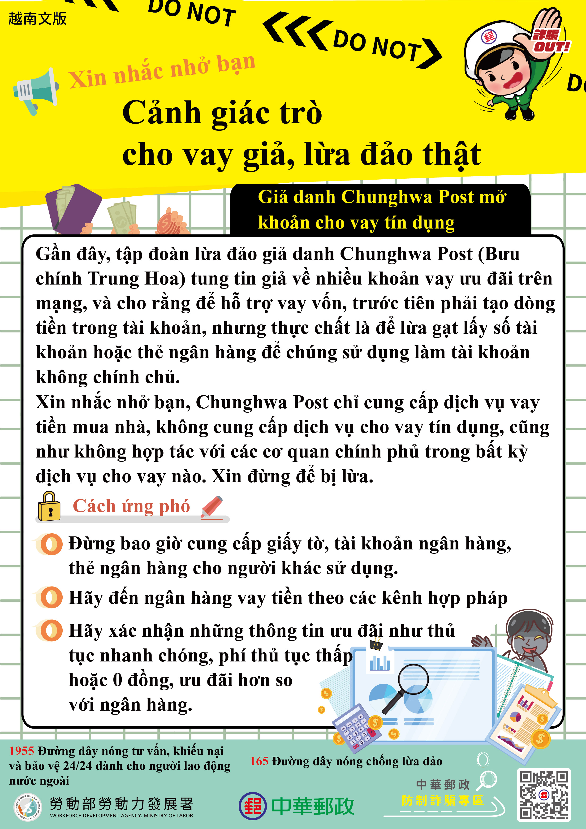 Xin nhắc nhở bạn, Chunghwa Post chỉ cung cấp dịch vụ vay tiền mua nhà, không cung cấp dịch vụ cho vay tín dụng, cũng như không hợp tác với các cơ quan chính phủ trong bất kỳ dịch vụ cho vay nào. Xin đừng để bị lừa.