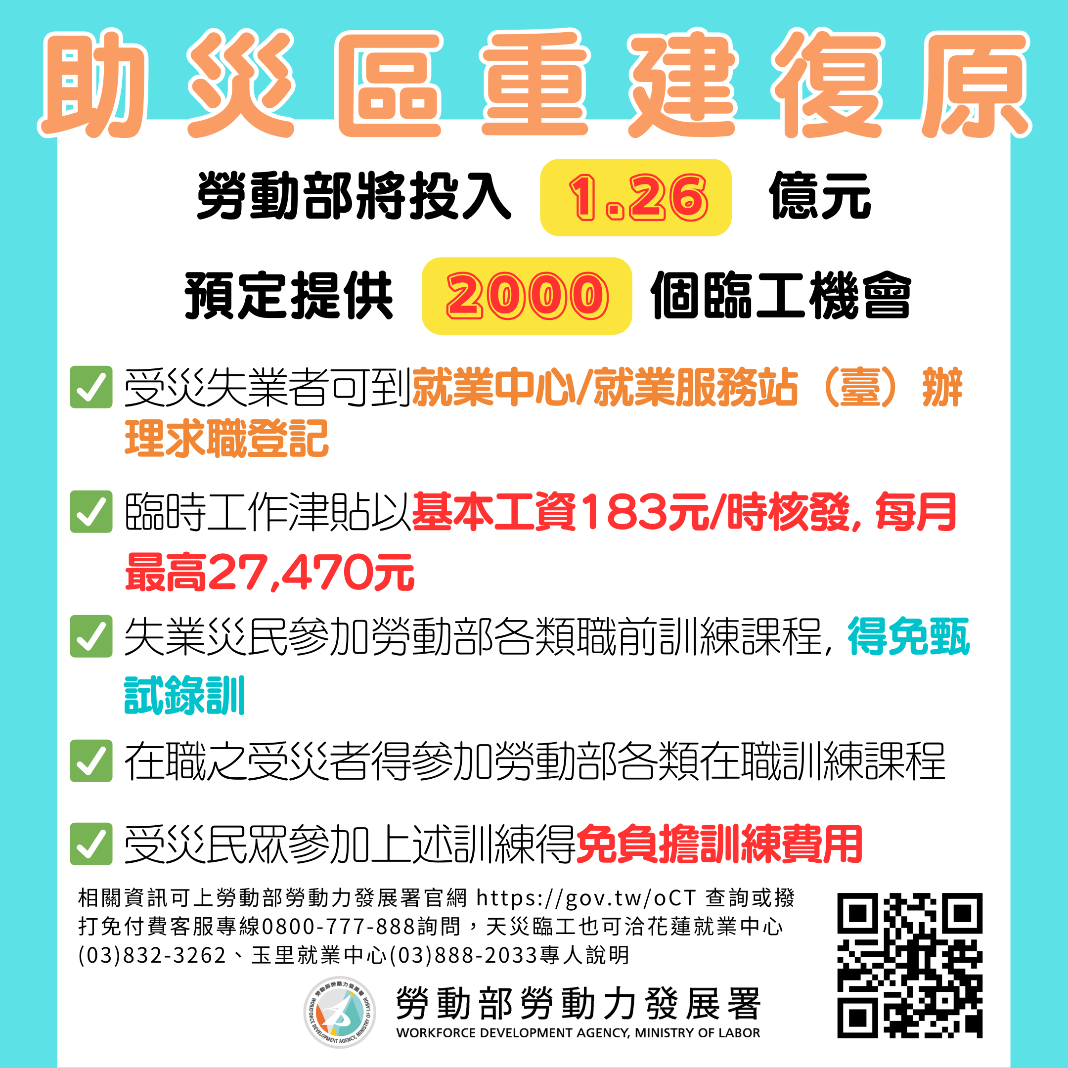 👉相關資訊可上勞動部勞動力發展署官網查詢,或撥打免付費客服專線0800-777-888詢問,天災臨工也可洽花蓮就業中心(03)832-3262、玉里就業中心(03)888-2033專人說明