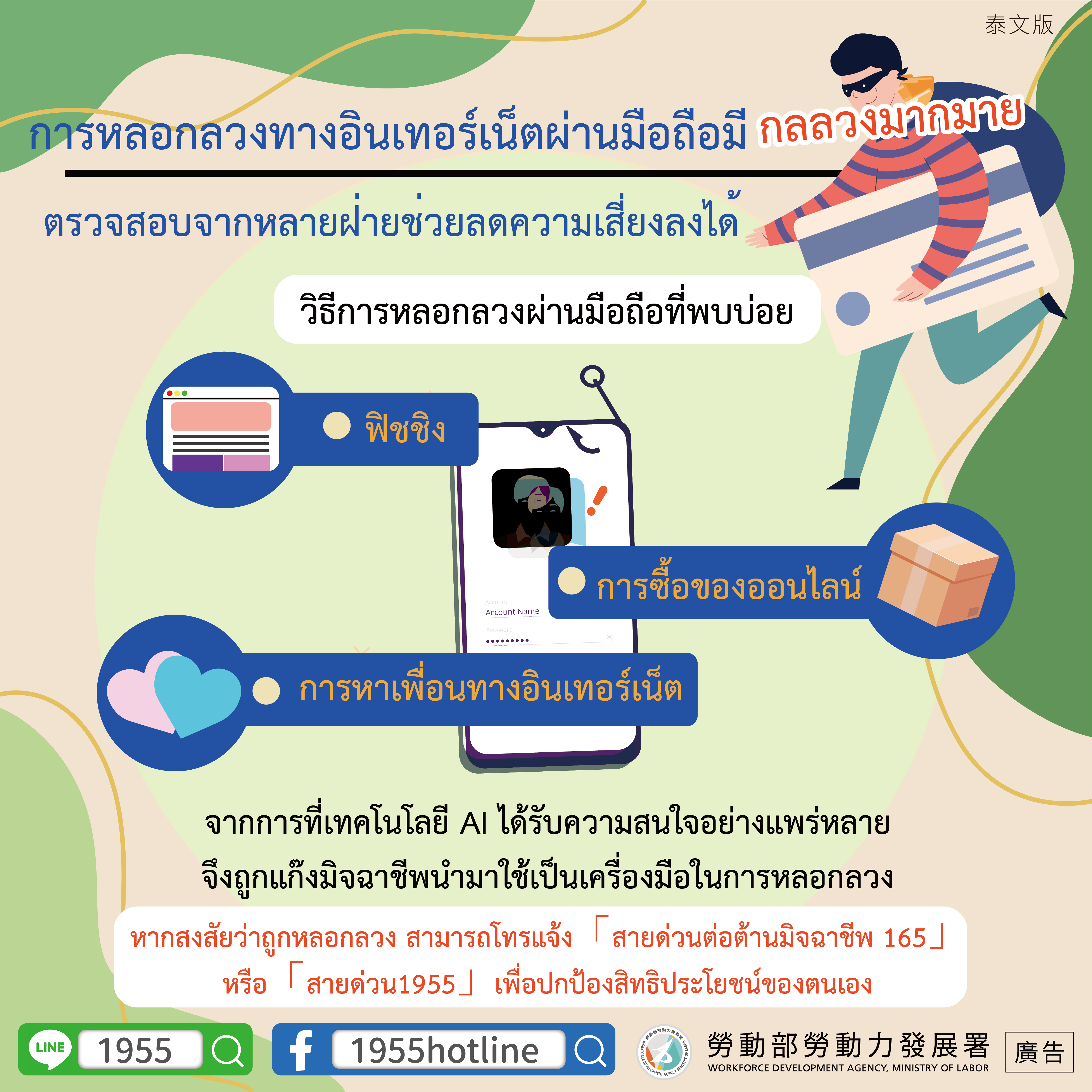 หากสงสัยว่าถูกหลอกลวง สามารถโทรแจ้ง「สายด่วนต่อต้านมิจฉาชีพ 165」หรือ「สายด่วน1955」เพื่อปกป้องสิทธิประโยชน์ของตนเอง
