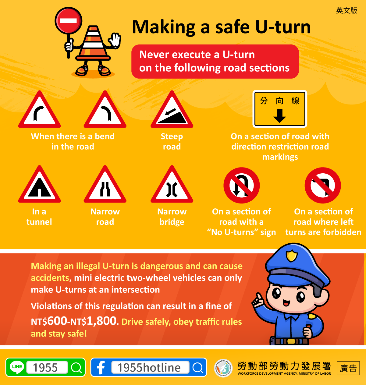 違規迴轉容易引發事故,騎乘微型電動二輪車時請務必到路口再轉彎