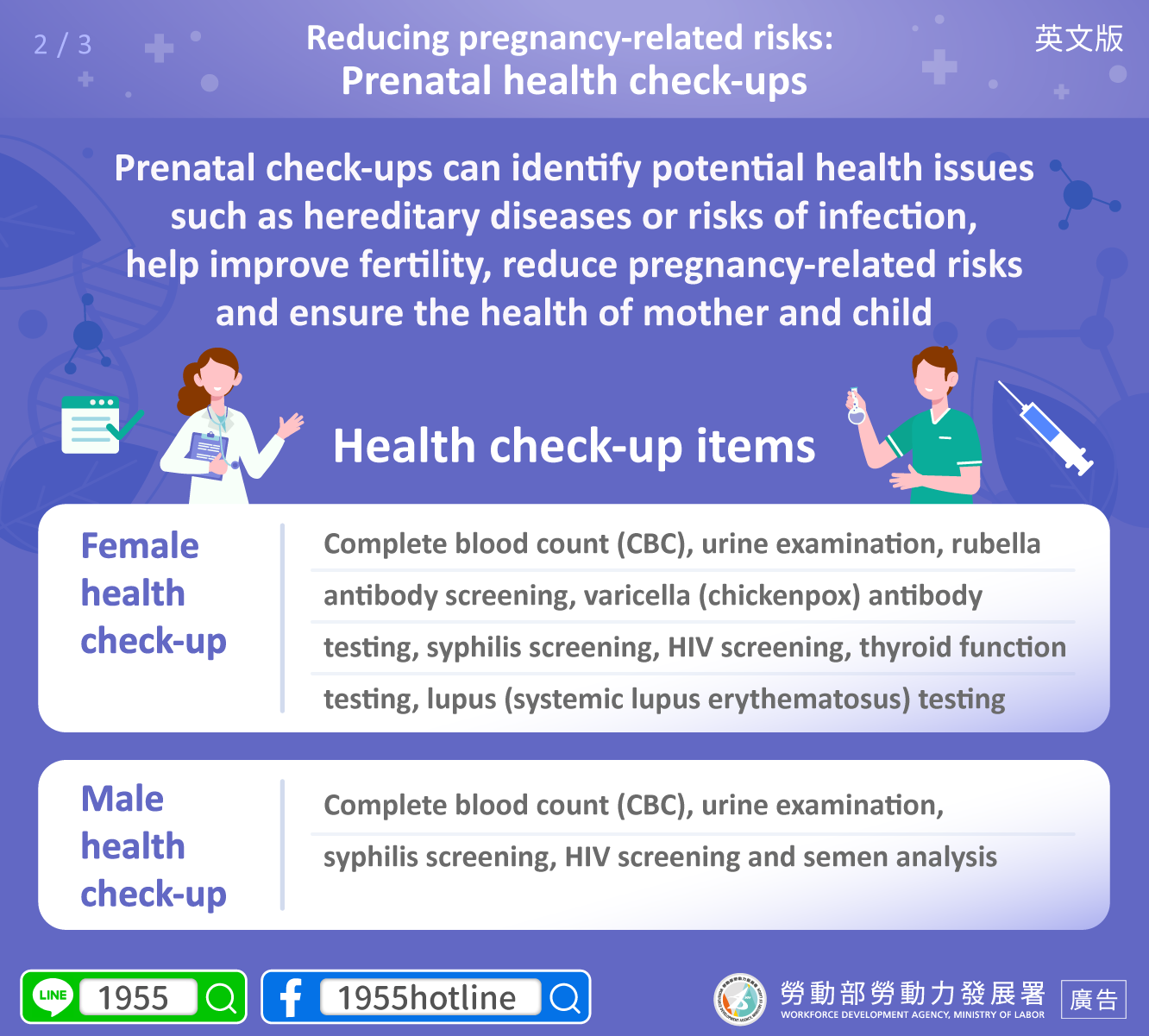 Dapat menggunakan“Bantuan medis untuk pekerja migran(peta medis)”di LINE21955mw_tw untuk ke klinik atau rumah sakit setempat untuk mengetahuilebih lengkap tentang informasi pemeriksaan kesehatan sebelum hamil, jika membutuhkan layanan penerjemah, silakan menghubungi 1955