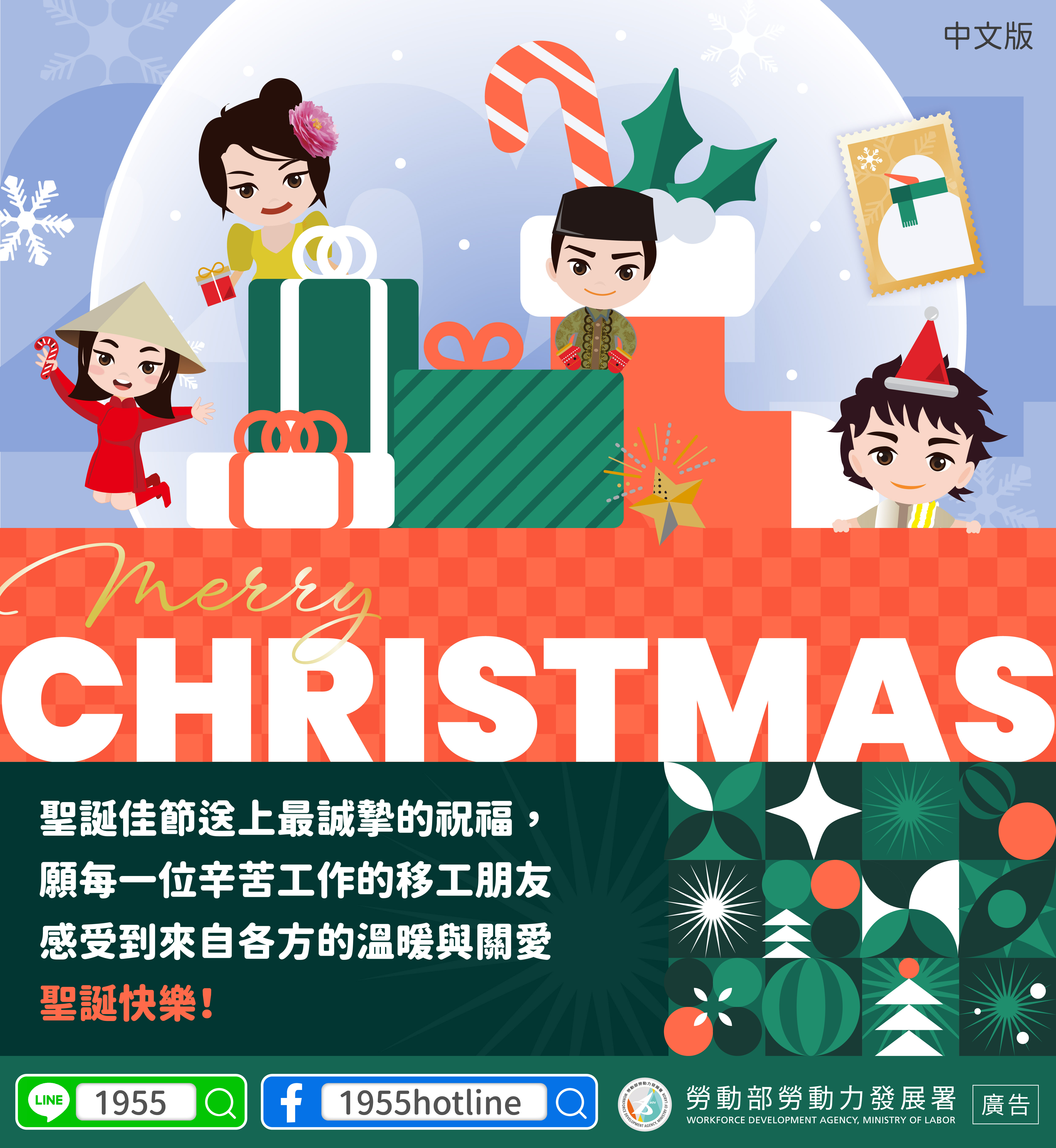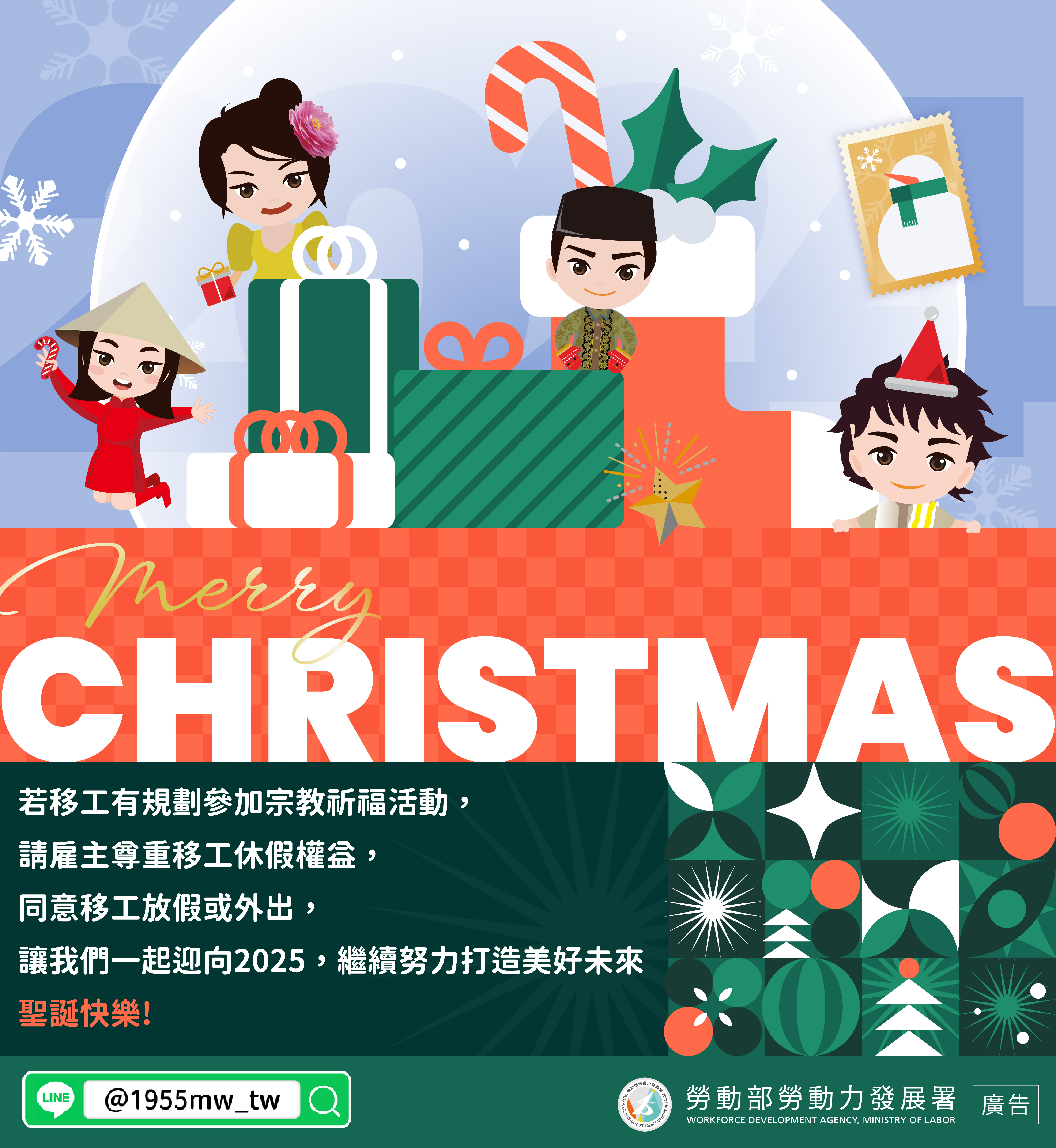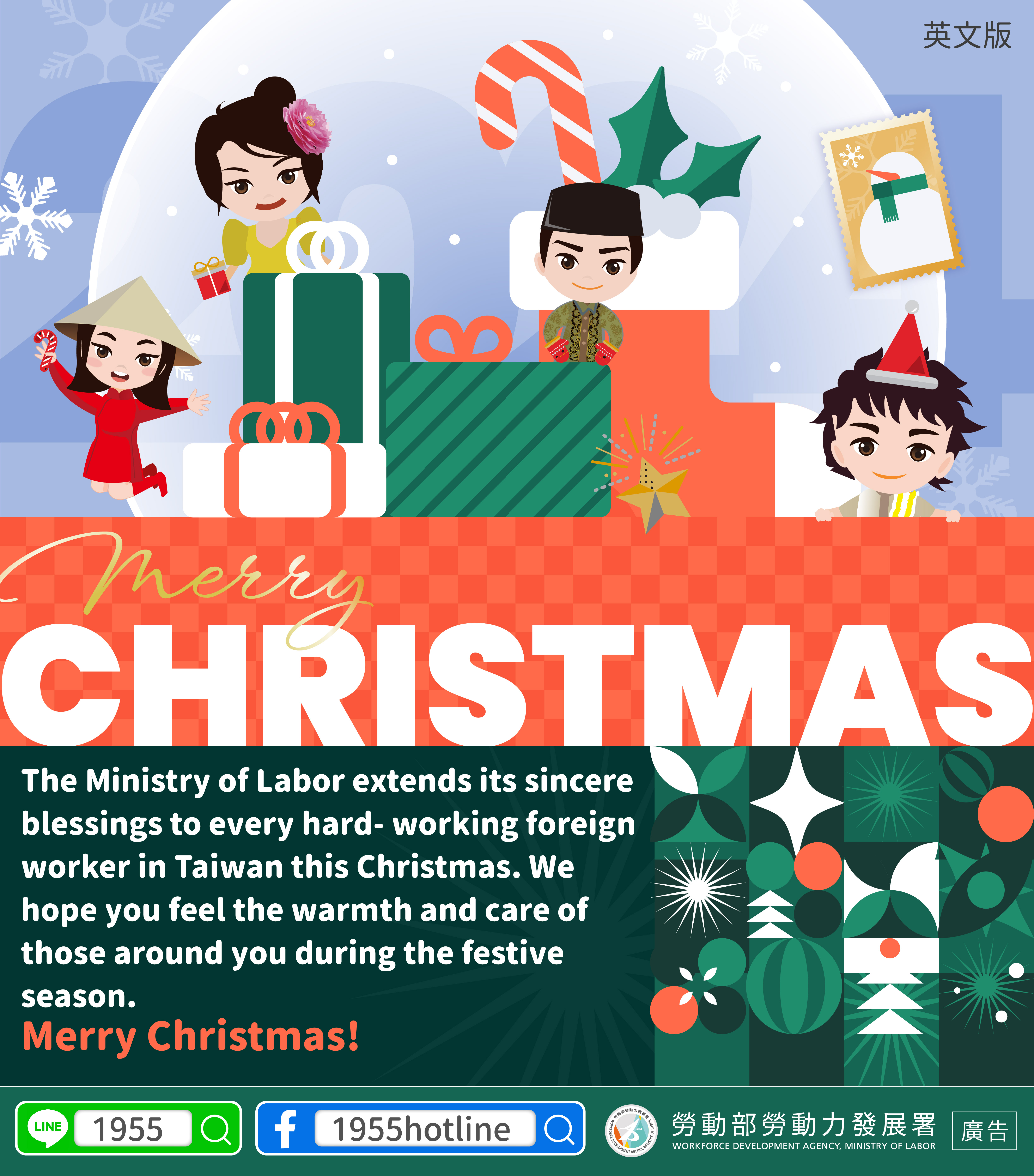 ▍The Ministry of Labor extends its sincere blessings to every hard- working foreign worker in Taiwan this Christmas. We hope you feel the warmth and care of those around you during the festive season.