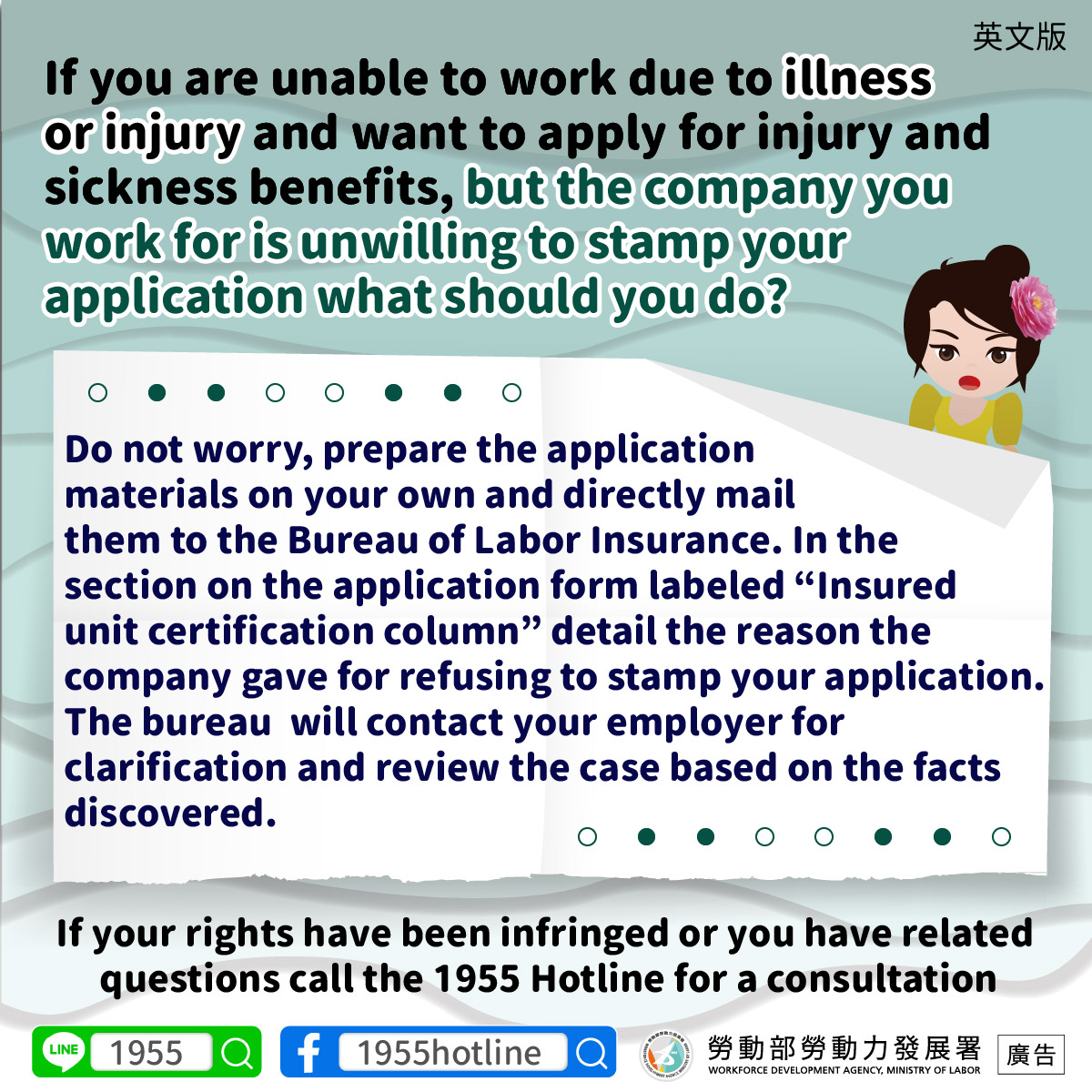 ไม่ต้องกังวล สามารถเตรียมแบบคำร้องด้วยตนเอง แล้วส่งทางไปรษณีย์หรือยื่นโดยตรงต่อสำนักงานประกันภัยแรงงานของไต้หวันได้ และในช่อง “การรับรองจากหน่วยงานผู้เอาประกัน” บนแบบคำร้อง ให้ระบุเหตุผลว่าบริษัทปฏิเสธที่จะประทับตรา จากนั้นสำนักงานประกันภัยแรงงานจะเป็นผู้ติดต่อไปยังบริษัทเพื่อตรวจสอบข้อเท็จจริงและจะดำเนินการพิจารณาตามสถานการณ์จริง